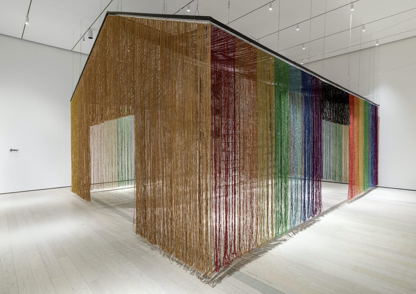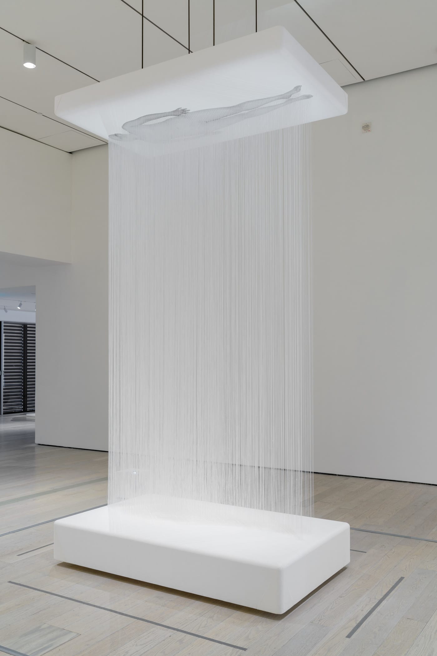 There are other ethereal works that similarly evoke the cultural and political censorship that has marked Chinese history since the Cultural Revolution. In Lin Tianmiao’s “Day-Dreamer” (2000), thin cotton strands hang down from the contours of a photographic self-portrait of the artist’s body, effectively obliterating it from view, and in Gu Wenda’s “american code” (2018-2019), a floating, room-sized tent, commissioned for the exhibition, is composed of entirely dangling, braided human hair. In both cases, the absence of the body, with its inherent agency for speech and action, is striking.