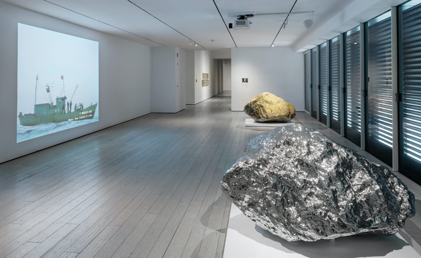 Seen through this lens, The Allure of Matter speaks in evocative silences, acknowledging the impermanence of materials, as in Yin Xiuzhen’s tomblike installation in “Transformation” (1997), where photographs of the rubble left behind at demolition sites of traditional houses in the artist’s hometown of Beijing sit atop tiles taken from those sites. Zhan Wang’s video, “Beyond 12 Nautical Miles Floating Rock Drifts on the Open Sea” (2000) — whose title refers to the distance beyond which any country can claim sovereignty over open waters — follows a hollow, stainless steel rock cast by the artist as it floats freely in international waters, negotiating immaterial borders with spectral grace.