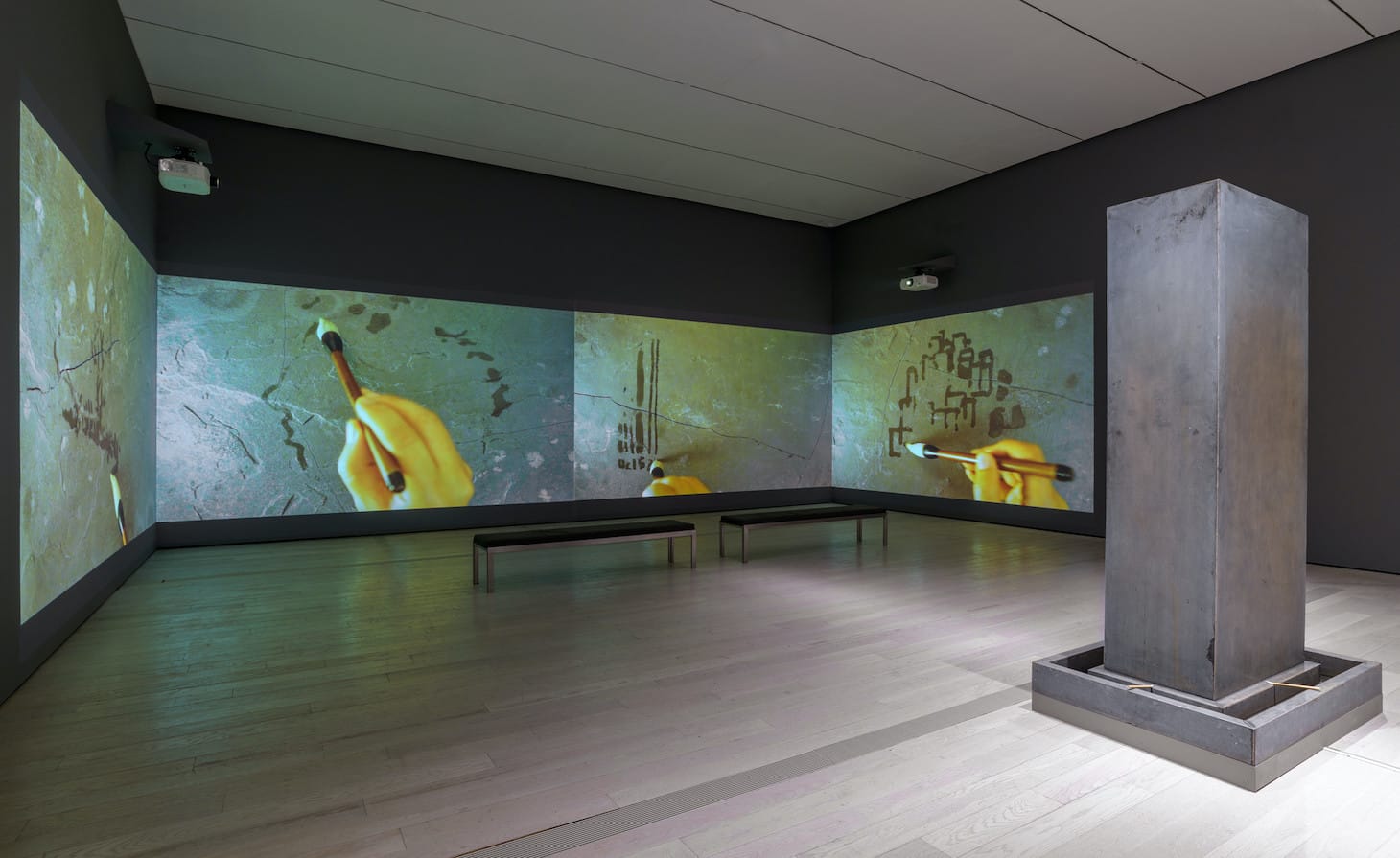 The term “Material Art” is a curiously paradoxical label given the remarkable immateriality of many of the works. The disappearance or dissolution of materials, rather than an insistence on their presence, is one of the most salient, unifying themes across the works. One example is Song Dong’s “Traceless Stele” (2016), in which visitors are invited to use Chinese calligraphy brushes to inscribe fleeting marks with water onto a stone slab. The painted shapes and phrases quickly fade, leaving no trace of material expression. The wall text notes that “when this work was shown in China, visitors were encouraged to write freely, since their words would immediately disappear.” In a similar vein, Wu writes in his catalogue essay that “water features frequently in experimental Chinese art to negotiate between representation and disappearing.”