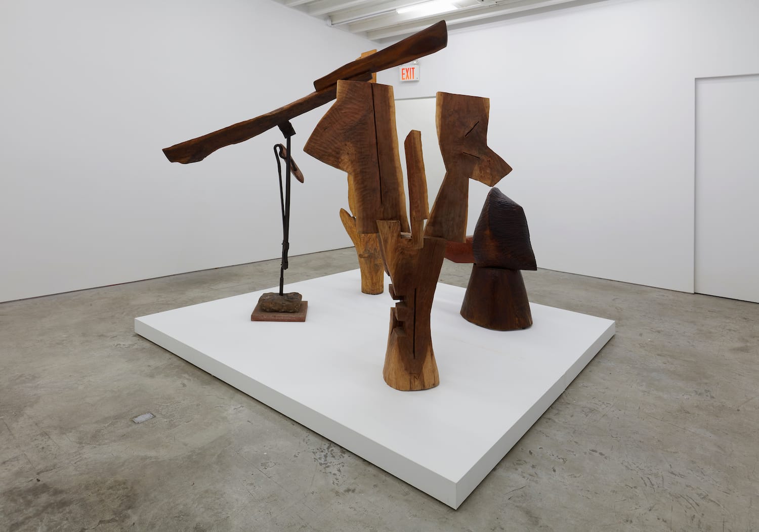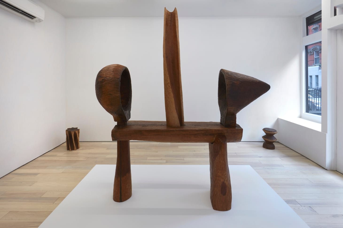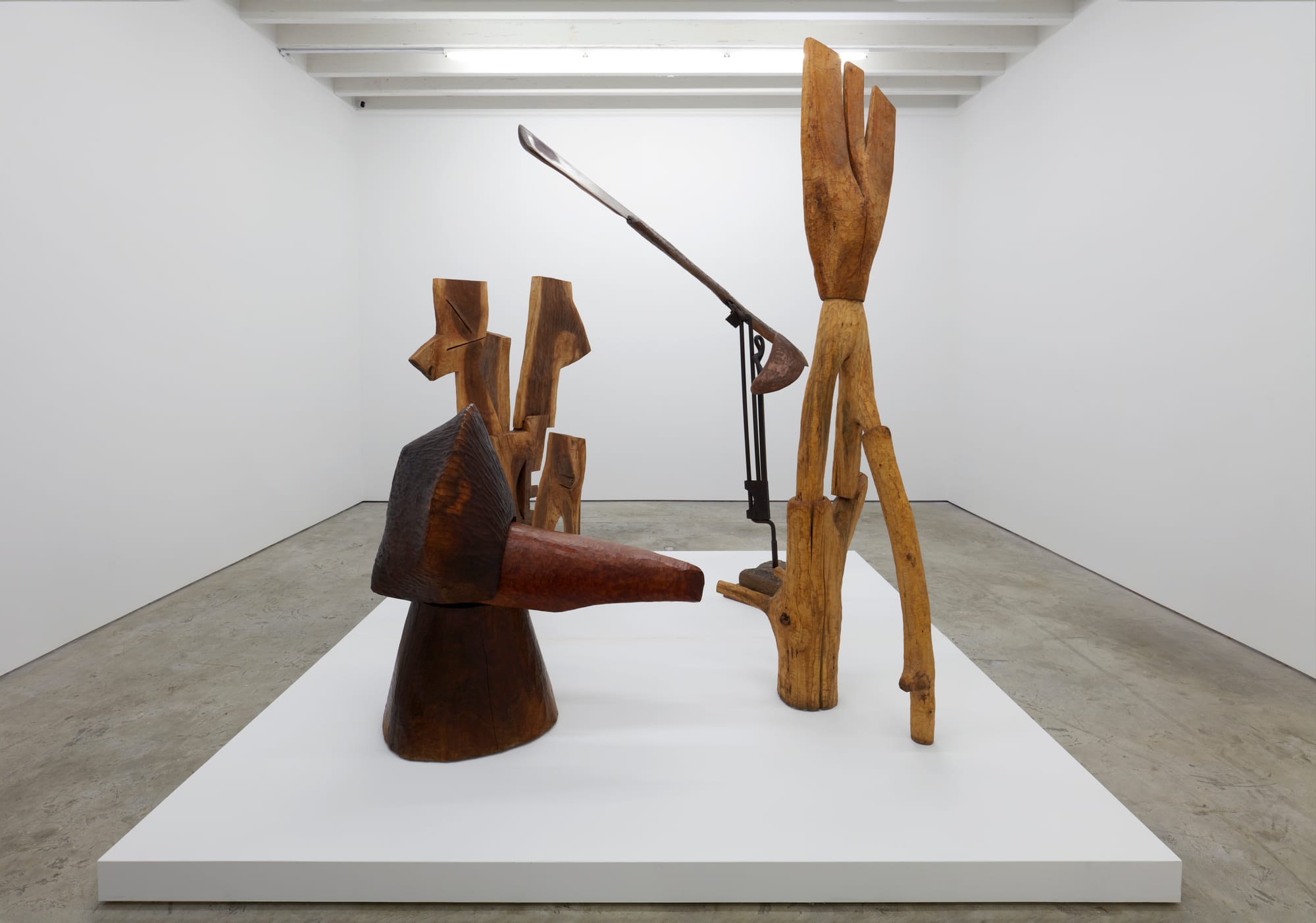 Thaddeus Mosley’s eponymous exhibition at Karma is the nonagenarian artist’s first with the gallery. A selection of 23 of Mosley’s wood sculptures, from 1996 to the present, fills Karma’s three spaces. Mosley’s favored materials are walnut and cherry wood, his palette deep auburns and browns. His oft-mentioned influences include Constantin Brancusi, Isamu Noguchi, and Alberto Giacometti, and art from the cultures and kingdoms of Bamum, Dogon, Baoulé, Senufo, Dan, and Mossi. Mosley is a serious jazz fan, and he notes in the exhibition’s press release that his sculptural process, like jazz, rests on improvisation: “I never know exactly what I’m doing. That’s also the essence of good jazz.”