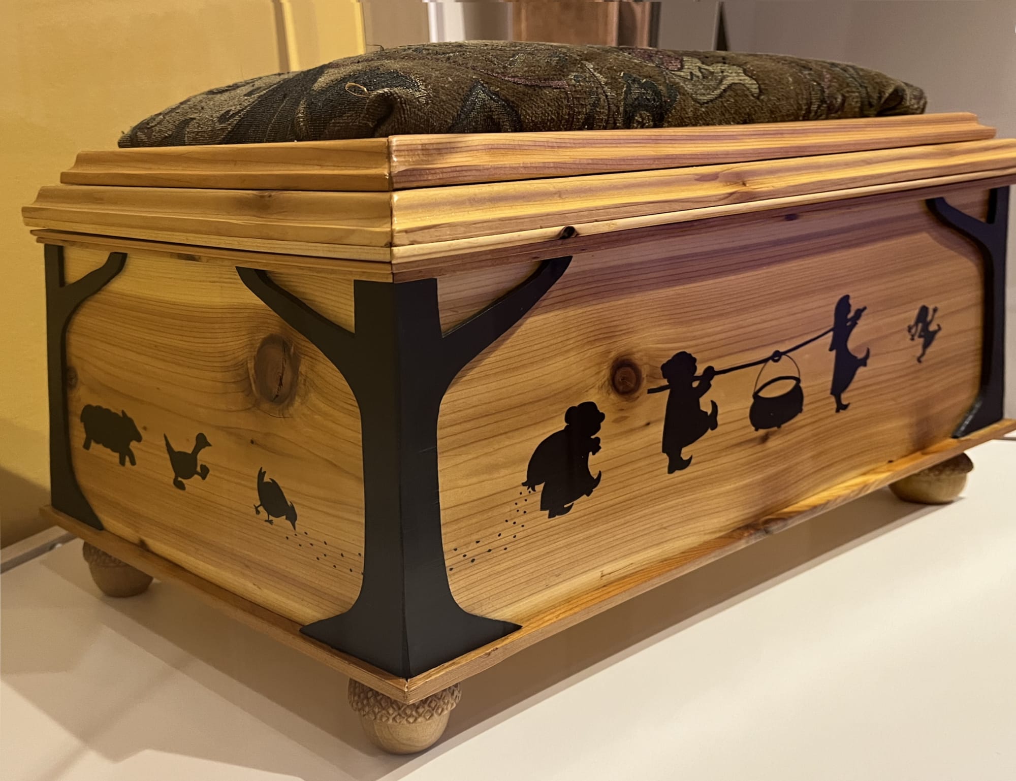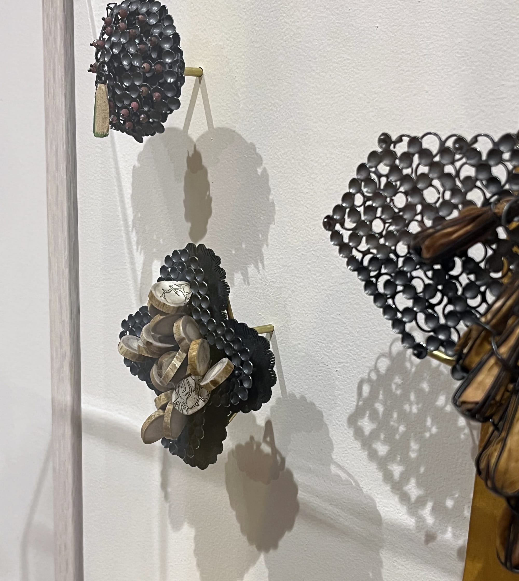 Even the materials tell stories: reindeer antlers; buffalo hide; small pieces of wood that were altered by a rescued cockatoo, tucked into sterling silver jewelry. Some of those materials were transformed with functionality in mind, such as John Frandy’s impressively intricate “Mantle Clock with crows (5) and pendulum” and his “Footstool” (both undated), decorated with fairytale-like silhouettes. Other interventions are more artistic and abstract, such as Lisa Wiitala’s series of Finnish ryijy; or Elizabeth Belz’s large metal moth and mosquito sculptures “Plume Moth” and “Dragon Butterfly” (both 2024). Many works in Nordic Echoes communicate a connection to nature, especially fauna and flora local to their Upper Midwest environments. Beth Kraus, for instance, crafted a guinea pig carrier from birch bark. There are two tiny holes where its feet would have been sticking out, and bite marks still visible on edges where it seemingly gnawed. One can imagine the fuzzy creature with beady eyes peering from her woven enclosure.