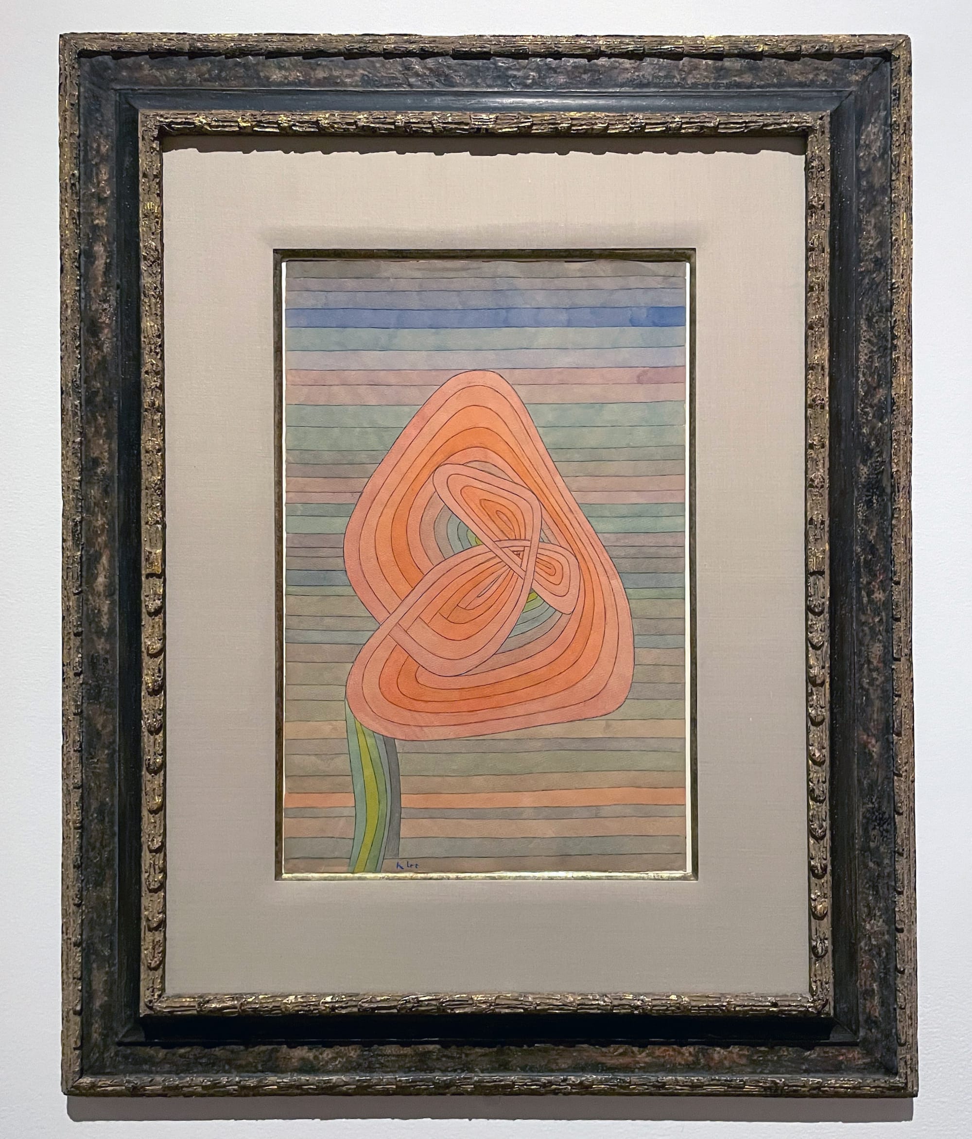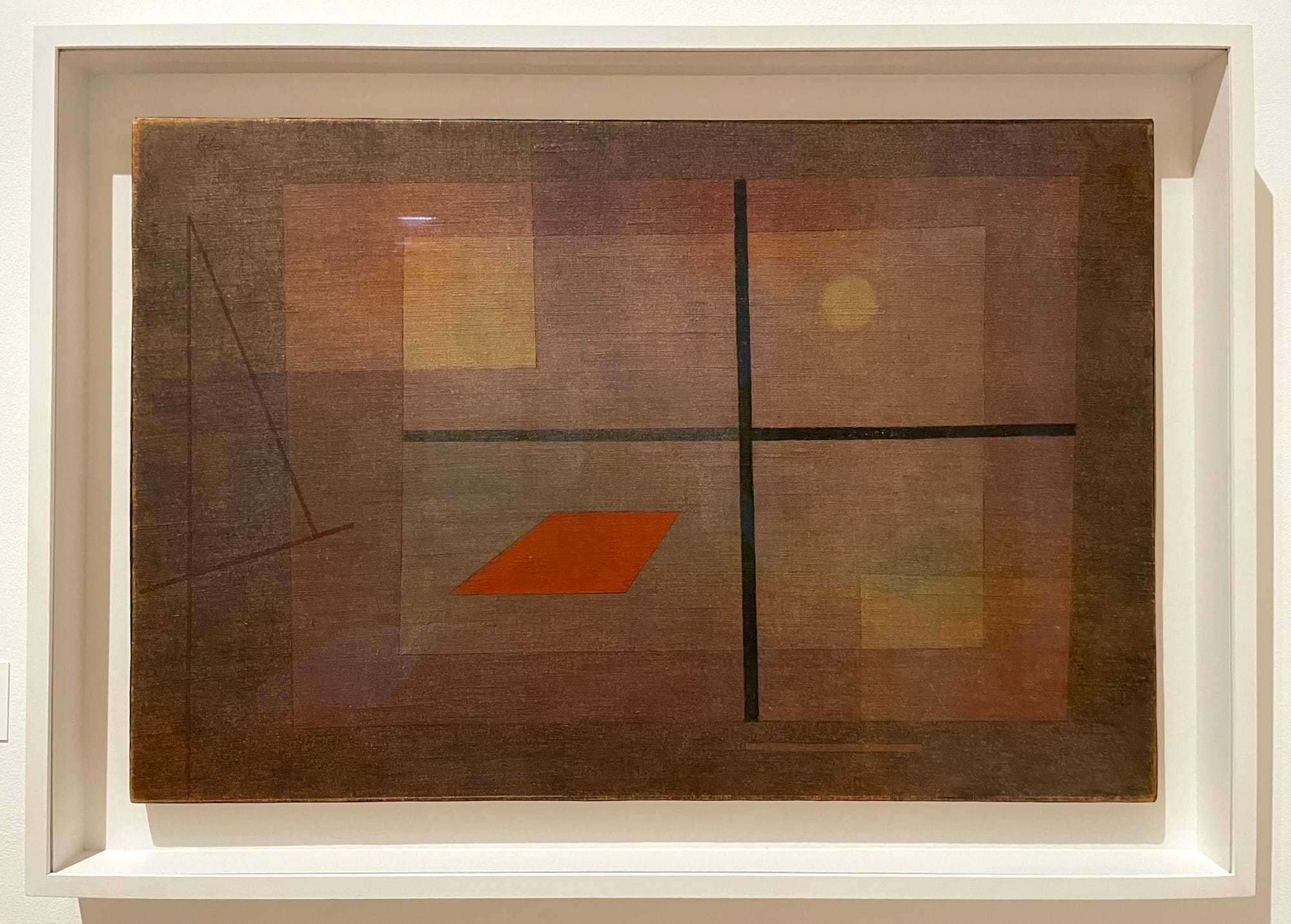 Once the show reaches Klee’s last decade, several pieces do allude to Germany’s descent into a fascist state. Some do so elliptically, such as the mixed-media watercolor “Suffering Fruit” (1934), depicting a pale, oblong shape with a closed eye and red patches, suggesting both a figure covered with rashes or a ripe pear. Others are more direct, as in “Struck from the List” (1933), a face partitioned into color blocks, referring to Klee’s dismissal from his teaching post by the Nazis. But just as many come across as ambiguous or allegorical — for instance, the linear “Lonely Flower” (1934), awash in translucent color, the foreboding “Forest Witches” (1938), its thick black lines suggesting hidden figures, and “But the Red Roof!” (1935), a softly luminous view through a window, rendered in thin earth tones and punctuated by a blazing orange-red parallelogram.