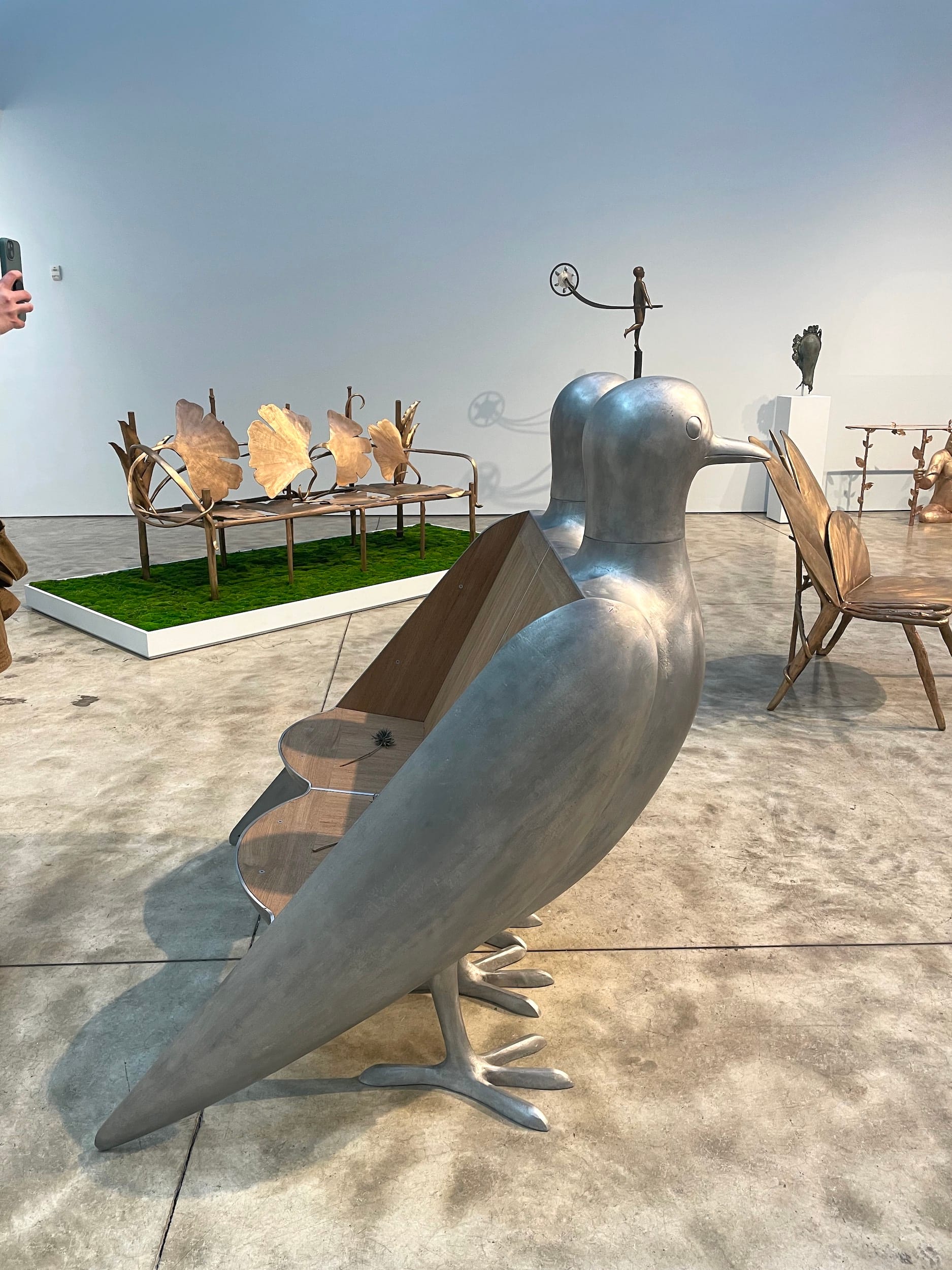 While the massive animals are impressive, the intricately detailed bronze foliage, flora, and fauna, most of which was created by Claude, is also stunning. In “Les Berces adossees” (2015), four oversized bronze gingko leaves compose the seat of a bench, while an additional four create a backrest. Bronze branches and other foliage holding the leaves together wrap around one another as if they’re dancing in harmony. The Lalannes co-created “Le Merle perché” (2006/2008), in which a small robin perches upon a tree branch, melding the animal with its natural environment.
