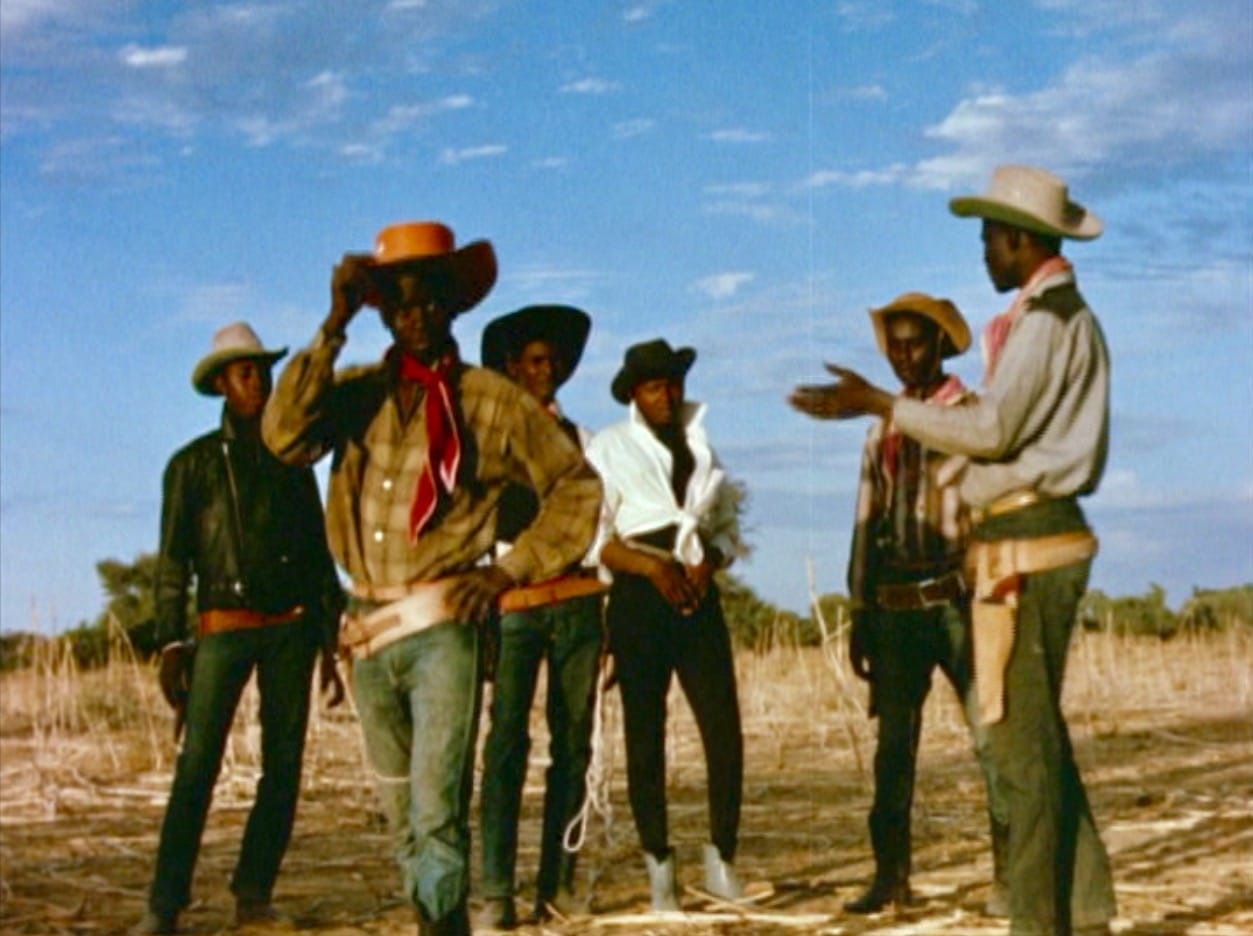 Also from 1966, Alassane’s extraordinary, 32-minute “Le Retour d’un aventurier” (The Return of an Adventurer) follows Jimi, a laborer who comes back to his home village adorned with traditional Western garb (i.e. a suit and tie). Jimi reconnects with childhood friends, bearing a suitcase impossibly stuffed with leather boots, gallon hats, and revolvers, soon turning them into a gang of self-styled Eastwoods. (He renames them “Black Cooper,” “John Kelly,” “Billy Walter,” and “Casse Tout,” which means “break everything.”) It takes only a few breathtaking and hilarious jump cuts for the posse to turn a makeshift watering hole into the site of a back lot–worthy brawl. Even after the crew has irrevocably crossed the village’s Islamic elders, Alassane’s film keeps its fiery political implications at arm’s length, letting the comedy speak through its own growing darkness.