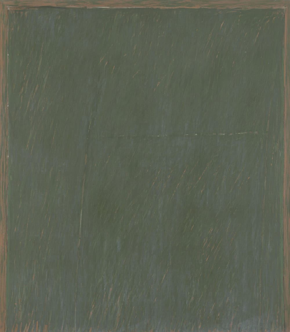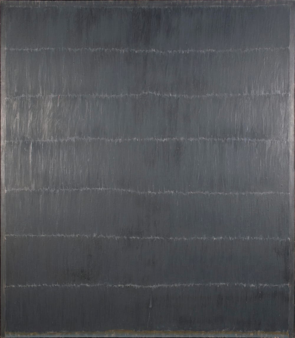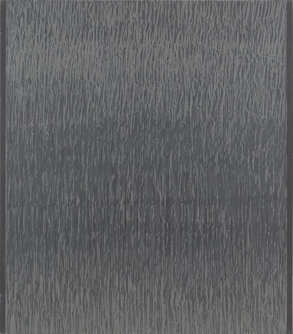 But the painting does exhibit a critique of formal properties of the kind that undergirds Minimalist and Conceptual thinking. It’s as if he is saying, this is paint, and this is what you can do with it — don’t bother looking at what has been done before because it is not going to help you find your path. Only an adherence to the painterly act can do that. As a case in point, “Idling II” (1970), done just two years after “Note,” takes paint in an opposite direction: while the composition is still based on rows of marks, the strokes have given way to manipulated drips and streams in shimmering tones of gray, like an orderly rainstorm.