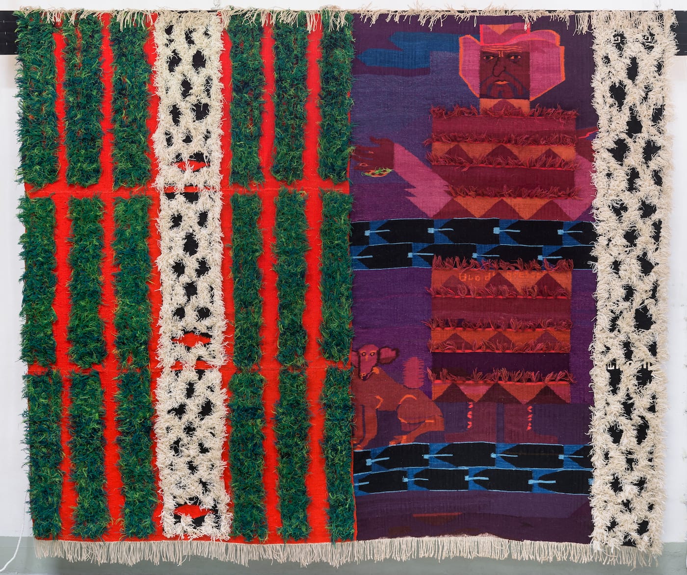 Although more interest in the idioms of figurative folk art, Ryggen would occasionally dabble in abstractionism to express the ineffable qualities of violence. In a later example, “Blood in the Grass” (1966), the artist settles into yet another political row — this time aimed at President Lyndon B. Johnson who had recently been photographed lifting his dog up by the ears. As angry as she was with the president, Ryggen was angrier at how his minor controversy overshadowed the Vietnam War. Still a loyal to the Communist cause, Ryggen depicts LBJ as an American cowboy coated in neon pink dye. (Surely a dig at American machismo.) To the president’s left is an abstract regiment of grassy green fiber sprouting from the tapestry, divided by ravines of bloody red pigment and a white fence. As a cumulative image, “Blood in the Grass” is a striking symbol of American ignorance during the Vietnam War. As with all her work, here, Ryggen is vigilant in the face of war, using art as an accountant of injustice.