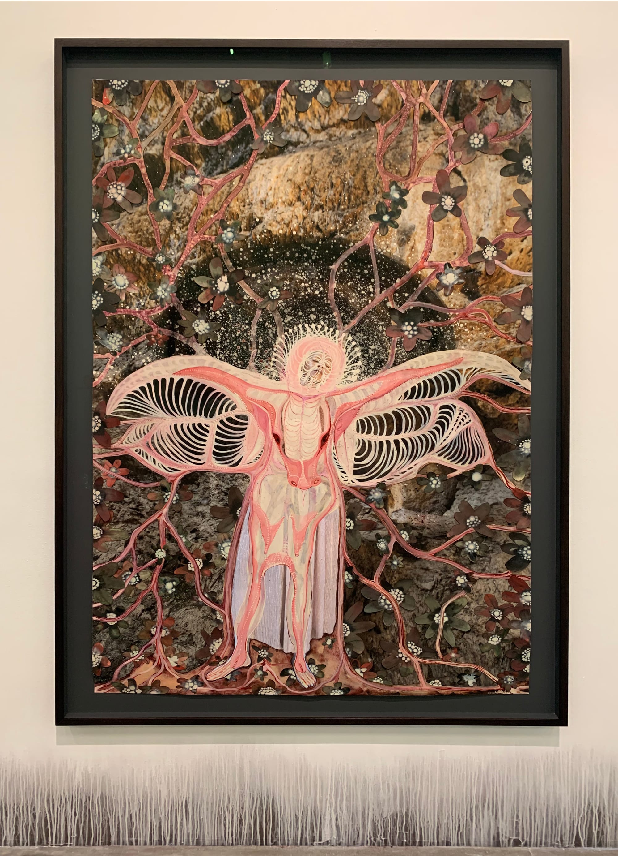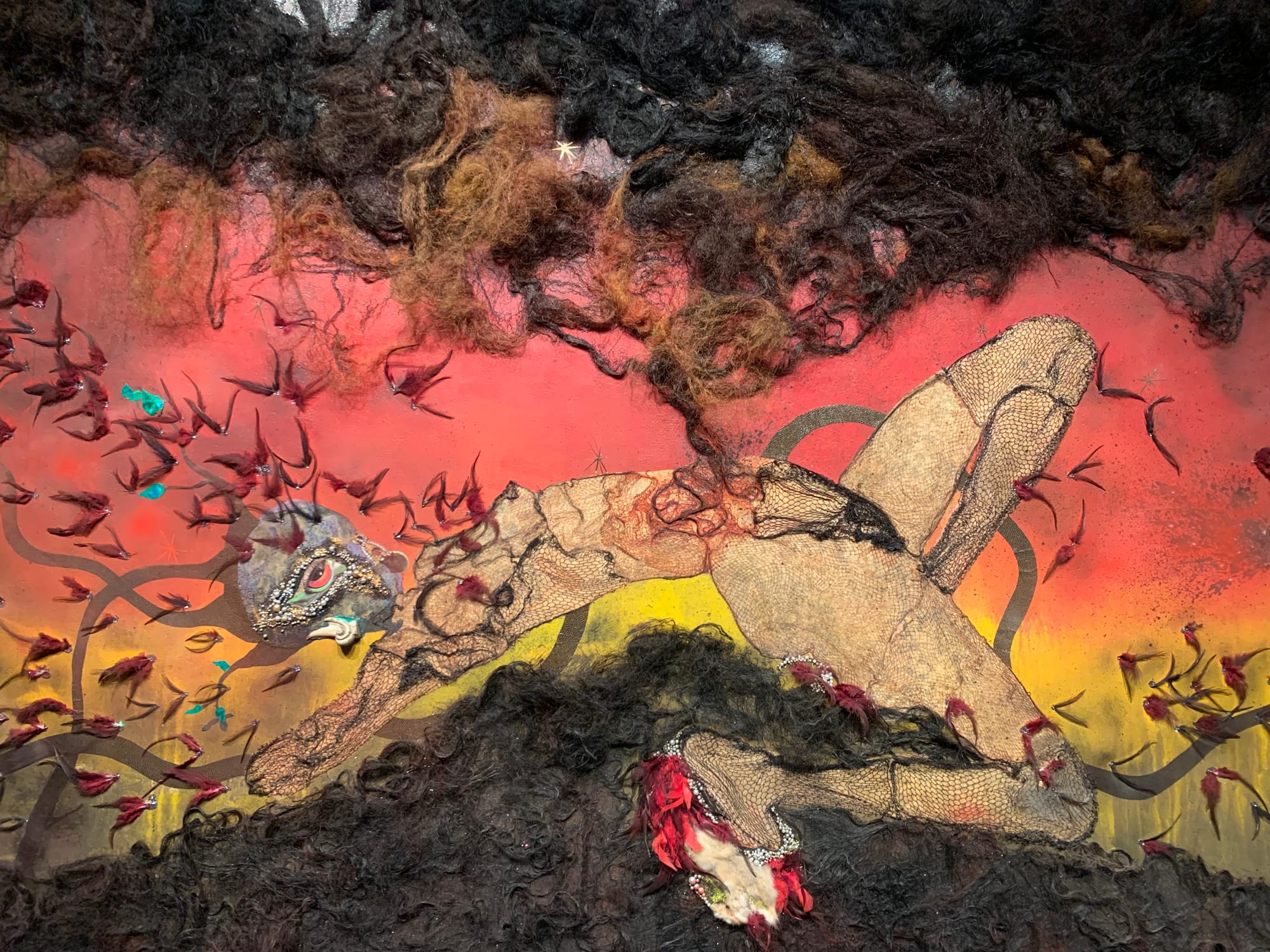 Abdur-Rahman builds the concept of “Black Grotesquerie” to describe aesthetic practices that capture racialized abjection, or radical possibility, through renderings of Black life at the porous borders of horror and freedom, living and dying, desire and disaster, and so on. I understand Black Grotesquerie as a mode through which artists confront the wreckage of a world built on anti-Blackness and choose to build an alternative. Indeed, it’s only through our refusal of a colorblind or postracial notion of existence that we live as Black people not (at least fully) fixed in what Abdur-Rahman aptly considers our “catastrophic present.” Wangechi Mutu’s mixed media collages and sculptures serve as the primary visual sources in this chapter. In “Howl” (2006), for instance, the anatomical disfiguration of Black women’s embodiment, in the literal sense of splattered blood and the metaphorical form of bleeding earth, creates an assemblage of forms both familiar and confounding. Mutu’s turn toward the grotesque to confront the anatomy of both Black people and Black worlds marked by slavery and colonialism exemplifies the regenerative capacities of experimental forms that don’t depend on building upon the anti-Black structures that exist.