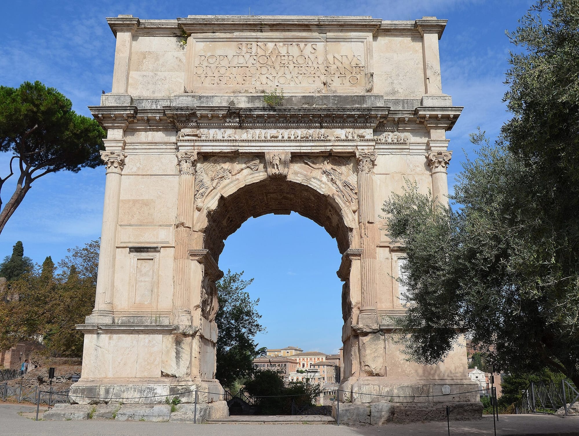 While not all arches commemorated the achievement of a Roman triumph, many did. Augustus had a triumphal arch voted to him by the Senate during his reign, as did several successive emperors including Septimius Severus and Constantine. Perhaps the best-known Roman arch today is the Arch of Titus at the entrance to the Forum, near the Colosseum. Then-Emperor Domitian had the arch built beginning in 81 CE to commemorate the achievements of his deceased brother, Titus, who destroyed the Second Temple at Jerusalem. Titus enslaved thousands of Jewish people and brought them to Rome during his father’s reign, likely to help build the Colosseum. The relief of the menorah being pillaged from the Second Temple is perhaps the most famous relief on a Roman triumphal arch, and was later used as a model for the Israeli state’s emblem not long after the occupation of Palestine began. It also has an eagle carrying Titus to heaven in apotheosis at the apex of the arch, with the goddess victory on the spandrels.