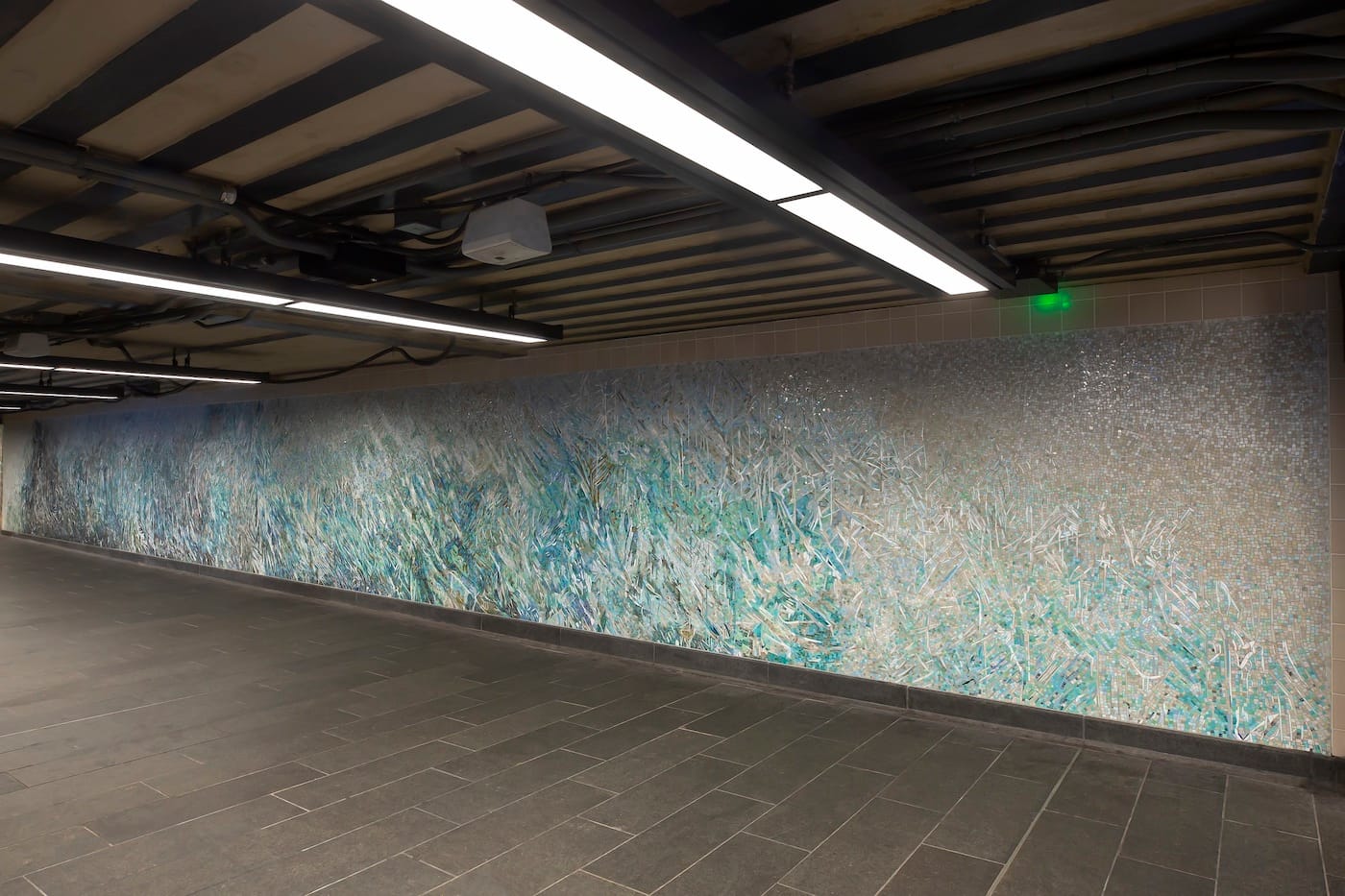 Commissioned by MTA Arts & Design for the mezzanine spaces at the 34th Street Penn Station subway stop, the permanent installation consists of two long murals. “The Arches of Old Penn Station” is an impressionist work of fluid line and turquoise tiling that recalls the latter-day bravura of the 1910 building, which was designed by the architecture firm McKim, Mead, and White. “The Arc of Gradiva” is based upon the literary work of the German author Wilhelm Jensen.