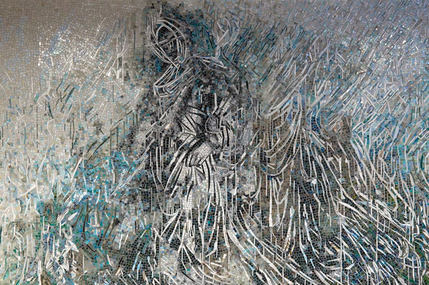There is an anticipation of change in Al-Hadid’s murals, particularly for the one depicting the old Penn Station. The image of the bygone transit hub emerges form a hazy cloud of grey tiles like a memory fading back into view. It is a palimpsest upon the wall, a reminder of former glory and a bequest for a better future. The artist has created etch-like markings on the mosaic with thinly sliced white tiles, that reinvent the famous image of the station’s concourse as a blueprint with perspectival depth and a hint of abstraction.
