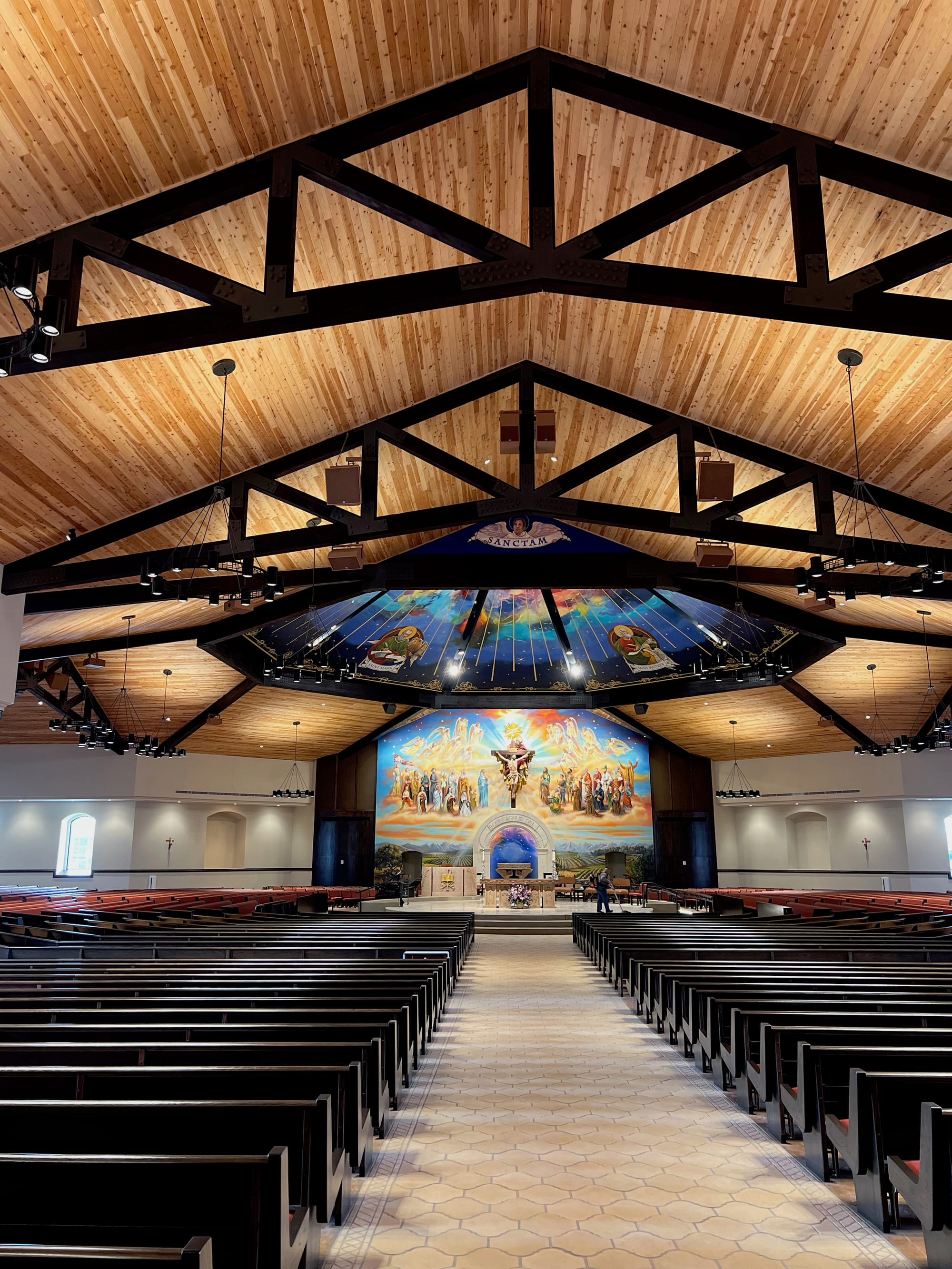 Beneath the dome, an altar and ambo (pulpit) carved from pink Mexican cantera stone rest on a spacious white travertine platform. A sequoia wood tabernacle will be added in the near future. A pair of 38-foot-tall retablo murals by Rohn and Associates Design, painted on canvas and joined at the center, displays a host of angels and devotional figures who look towards a carved Trinity that juts forward from the wall.
