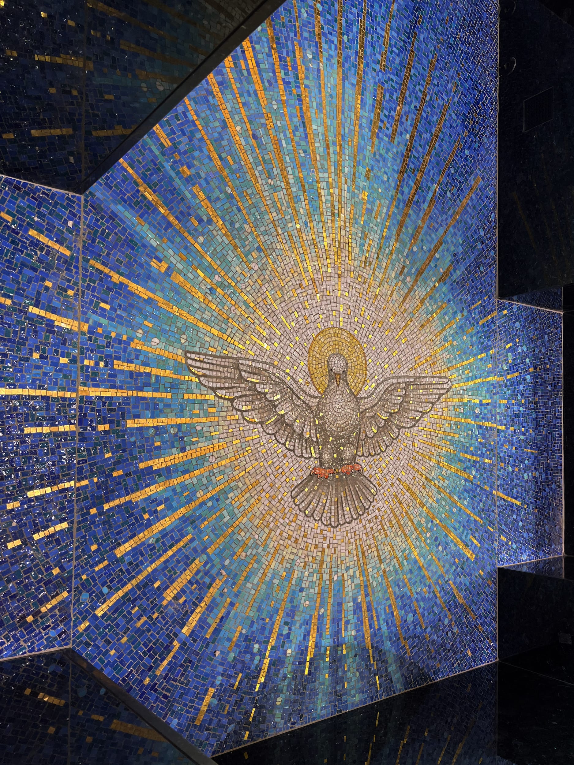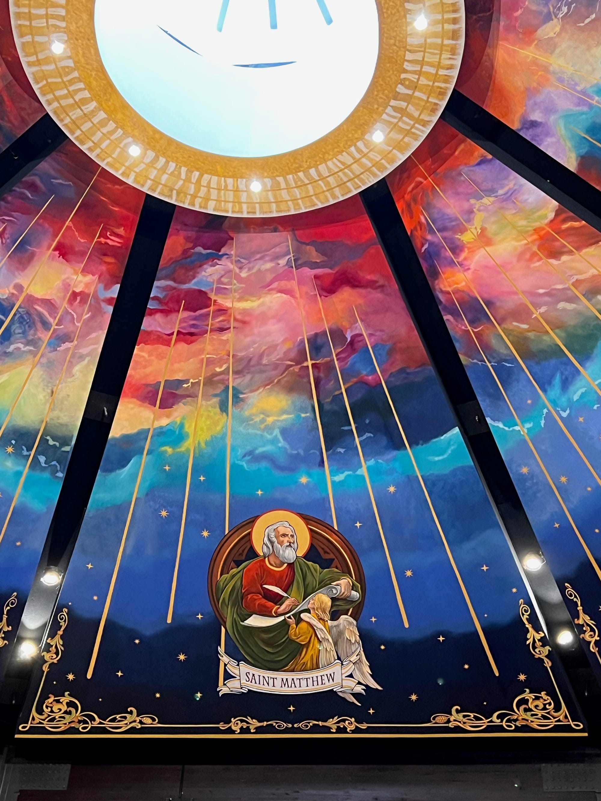 The figures and their surrounding cosmos, which includes imagery taken from the observations of the Hubble telescope, were painted by a team of liturgical artists supervised by Rolf Rohn of Philadelphia’s Rohn and Associates.