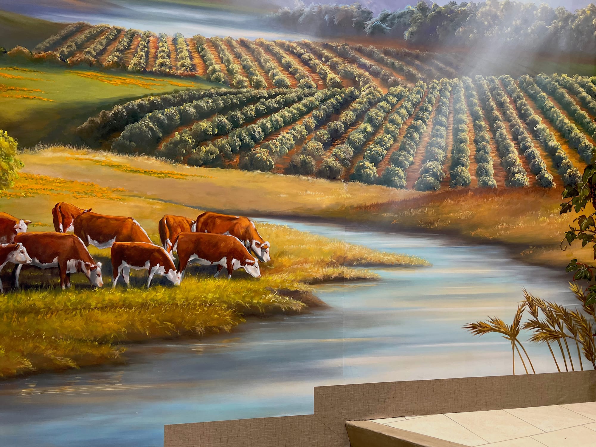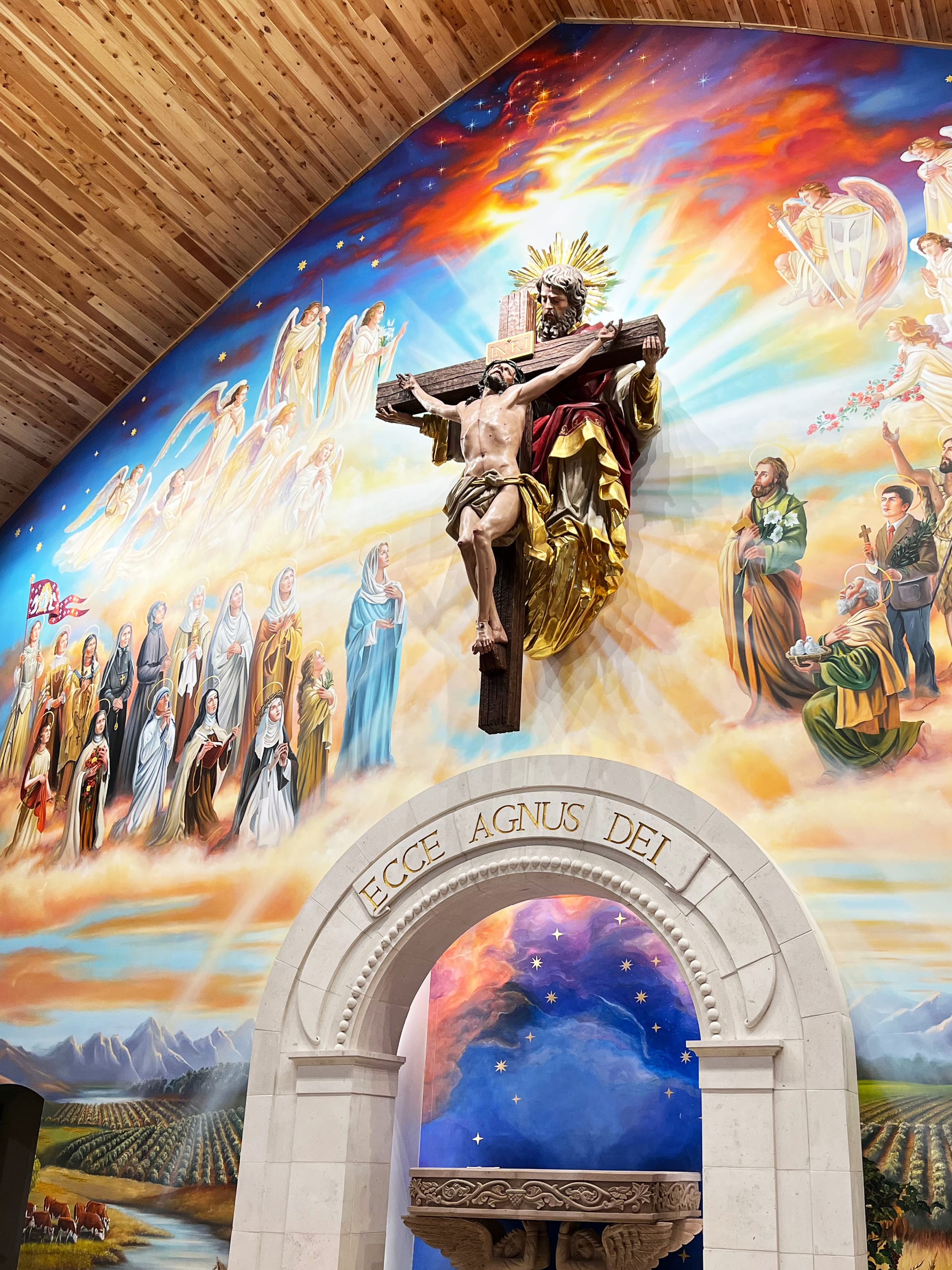 The Trinity, carved from linden wood in Sevilla, Spain, incorporates polychromed figures of God the Father (the largest at 10 feet tall), a crucified Christ, and the Holy Spirit. Supported by special steel frames devised by structural engineers, this sacred tableau shoots rays of light towards the heavens and also downwards towards the purple hills and grazing cattle of an idealized Central California landscape. Filled with local flora — Valley Oaks, California Poppies and citrus trees —the mural has a high-key presence that feels a bit like a Pixar movie.