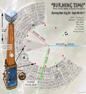 At over 5,000′ feet wide, high powered lasers will keep accurate time with hour, minute and second hands marking artistic 22′ towers over the heads of the 50,000 festival goers that attend the Burning Man Festival in the Nevada Desert every year in August.
