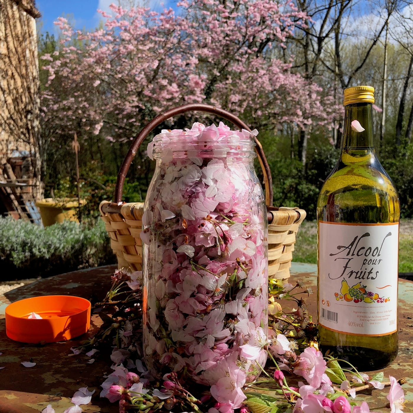 Pick a very large quantity of cherry blossoms — about 1 kg. Stuff all the cherry blossoms into the jar. Fill with alcohol. Cover and set aside for three to five days. Strain/decant the resulting extraction into a bottle. Discard the remaining flower pulp.