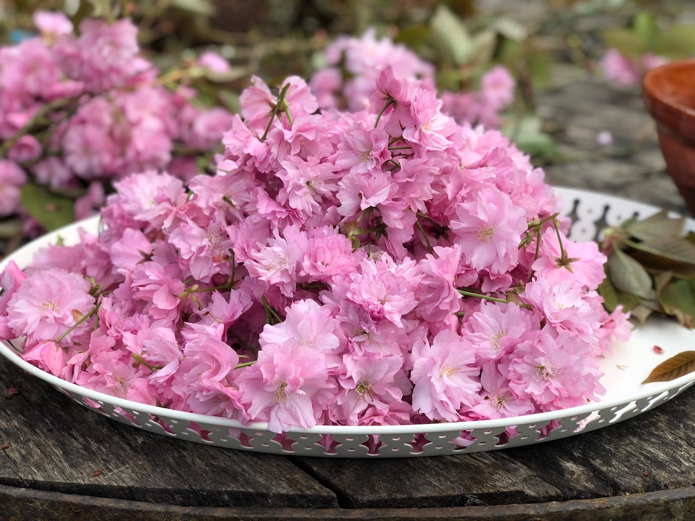 If he would answer my calls, I’d be able to tell him about the second batch of petals I harvested last week from the double-blossoming cherry trees on the path to my friend’s canal barge. I pickled these. The Japanese way. Another the advantage of being me is that my friend’s cooking school has three kitchens, one of which became the sakura kitchen for a week.