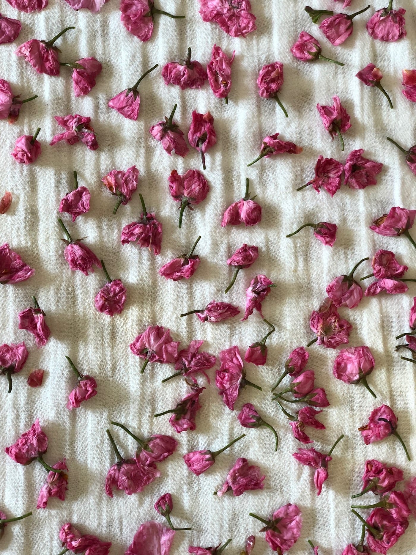“A normal artist would just take a picture of the tree and be done,” my Camont Kitchen friend laughed as I laid out hundreds of blossoms individually on torchons (large tea towels). Every horizontal surface of the kitchen was covered with mats of drying pickled cherry blossoms.