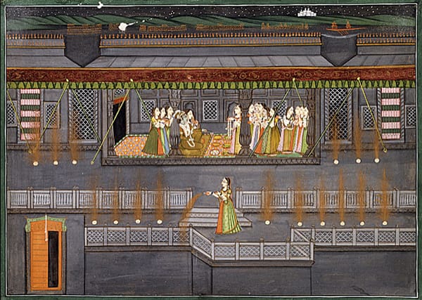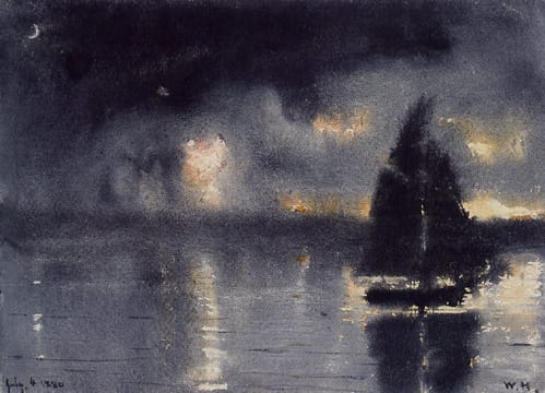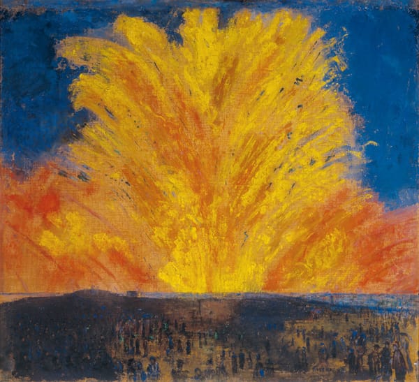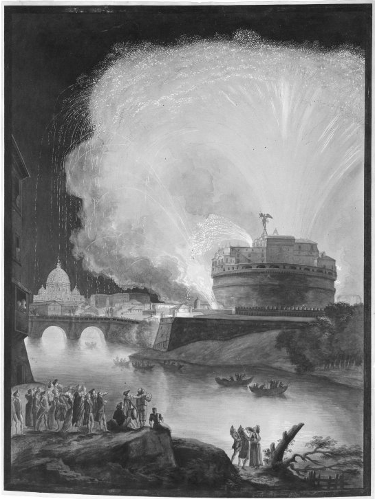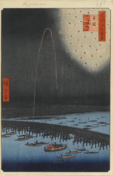 Hand colored etching of "A VIEW of the FIRE-WORKES and ILLUMINATIONS at his GRACE the Duke of RICHMOND'S at WHITEHALL and on the River Thames on Monday 15 May 1749." (1749) (via Wikipedia)Giovanni Paolo Panini, "Preparation Of The Fireworks" (18th C.) (via superstock.com)India, Rajasthan, Kishangarh, South Asia, "Krishna and Radha Enjoying a Feast and Fireworks" (early 19th century) (via lacma.org)Henri Pierre Léon Pharamond Blanchard, "Fireworks /Feuerwerk" (1856) Utagawa Hiroshige (Ando), "Fireworks at Ryogoku (Ryogoku Hanabi), No. 98" from One Hundred Famous Views of Edo (1858) (via brooklynmuseum.org)Unknown American Artist, "Fireworks Over Castel St. Angelo, Rome" (nd) (via BrooklynMuseum.org)Winslow Homer, "Sailboat and Fourth of July Fireworks" (1880) (via thecityreview.com)James Ensor, "Fireworks" (1887) (via moma.org)Félix Vallotton, "Fireworks" (1901) (via moma.org)David Bueno de Mesquita, "Vuurwerk op de Amstel - Fireworks over the river Amstel, on the occasion of the silver jubilee of Queen Wilhelmina" (1923) (via christies.com)Sam Francis, "Firework" (1963) (via moma.org)Cai Guo-Qiang's "Fireworks From Heaven" at the Charles J. Colton School during Prospect.1 in New Orleans, 2008.Another project in lower Manhattan by Cai Guo-Qiang, "Transient Rainbow" (2002), was created for the opening of MoMA QNS. It featured a rainbow of fireworks. This was done again in 2009 above Tian'anmen Square and billed as the world's largest "firework paintings." (image via asianartnewspaper.com)Rosemarie Fiore's "Firework Drawing #7" (2009) (via rosemariefiore.com)