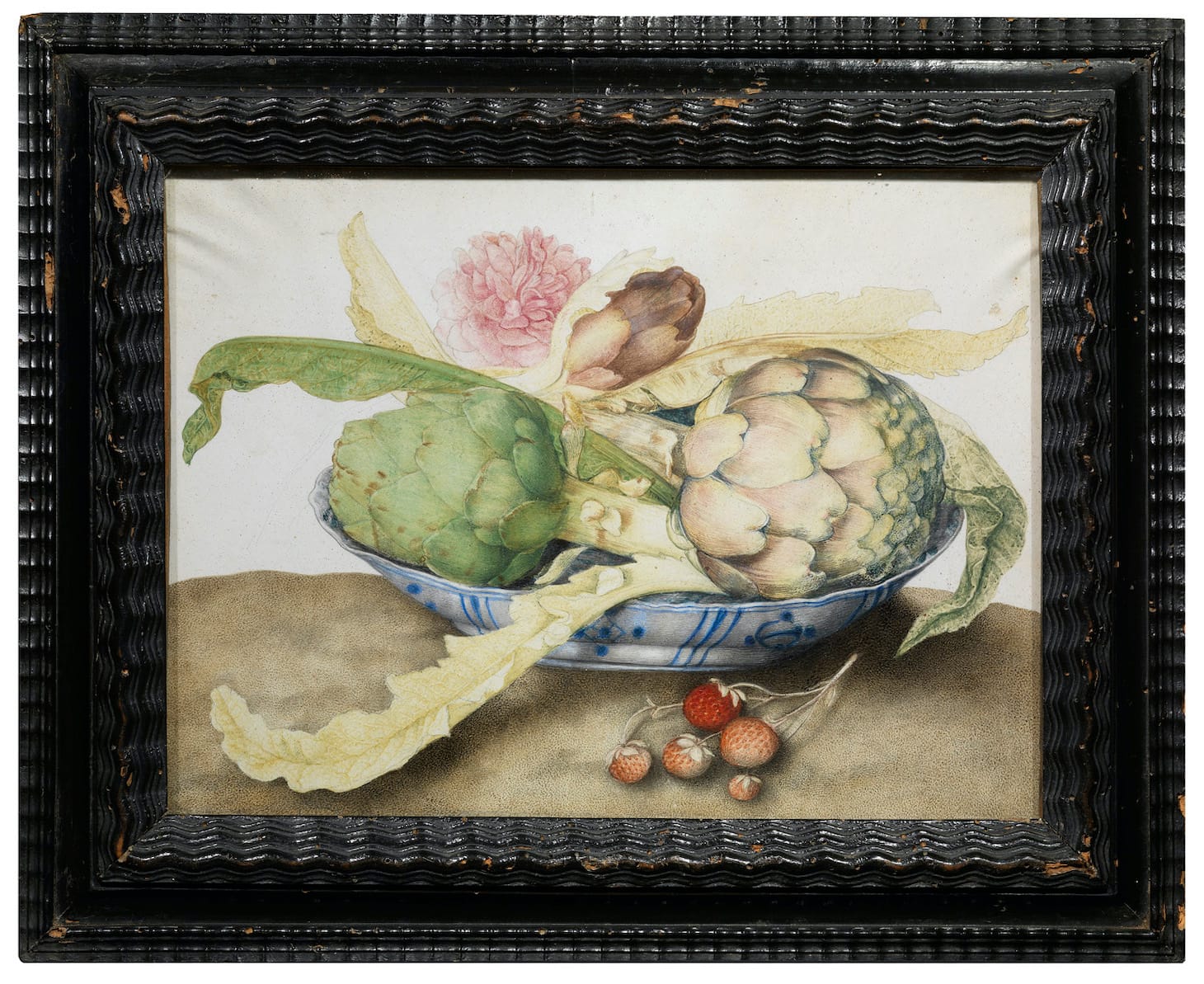 Giovanna Garzoni, “Still Life with a Chinese Plate, Artichokes, a Rose and Strawberries” (c. 1640s), miniature on parchment (image courtesy of Galleria Palatina, Palazzo Pitti, Gallerie degli Uffizi, Firenze)