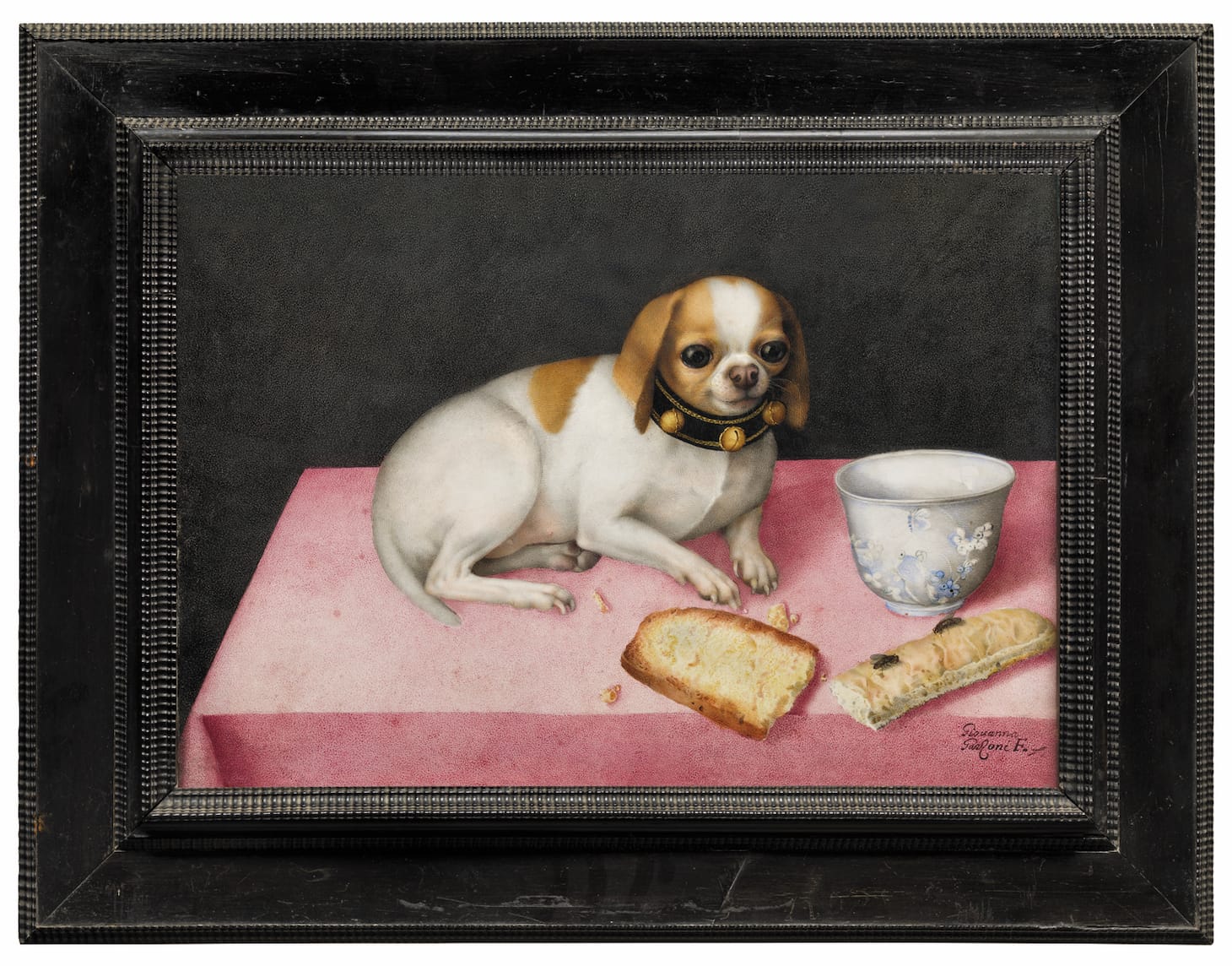 Giovanna Garzoni, “Dog with a Biscuit and a Chinese Cup” (1640s),” miniature on parchment (image courtesy Galleria Palatina, Palazzo Pitti, Gallerie degli Uffizi, Firenze)