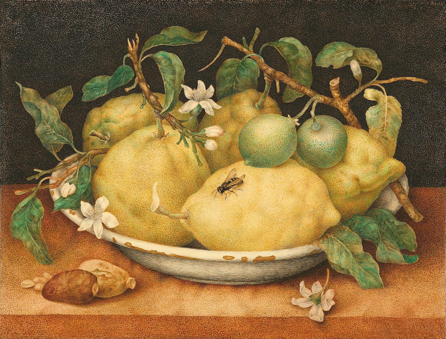 Giovanna Garzoni, “Still Life with Bowl of Citrons” (late 1640s), tempera on vellum (via Wikimedia)