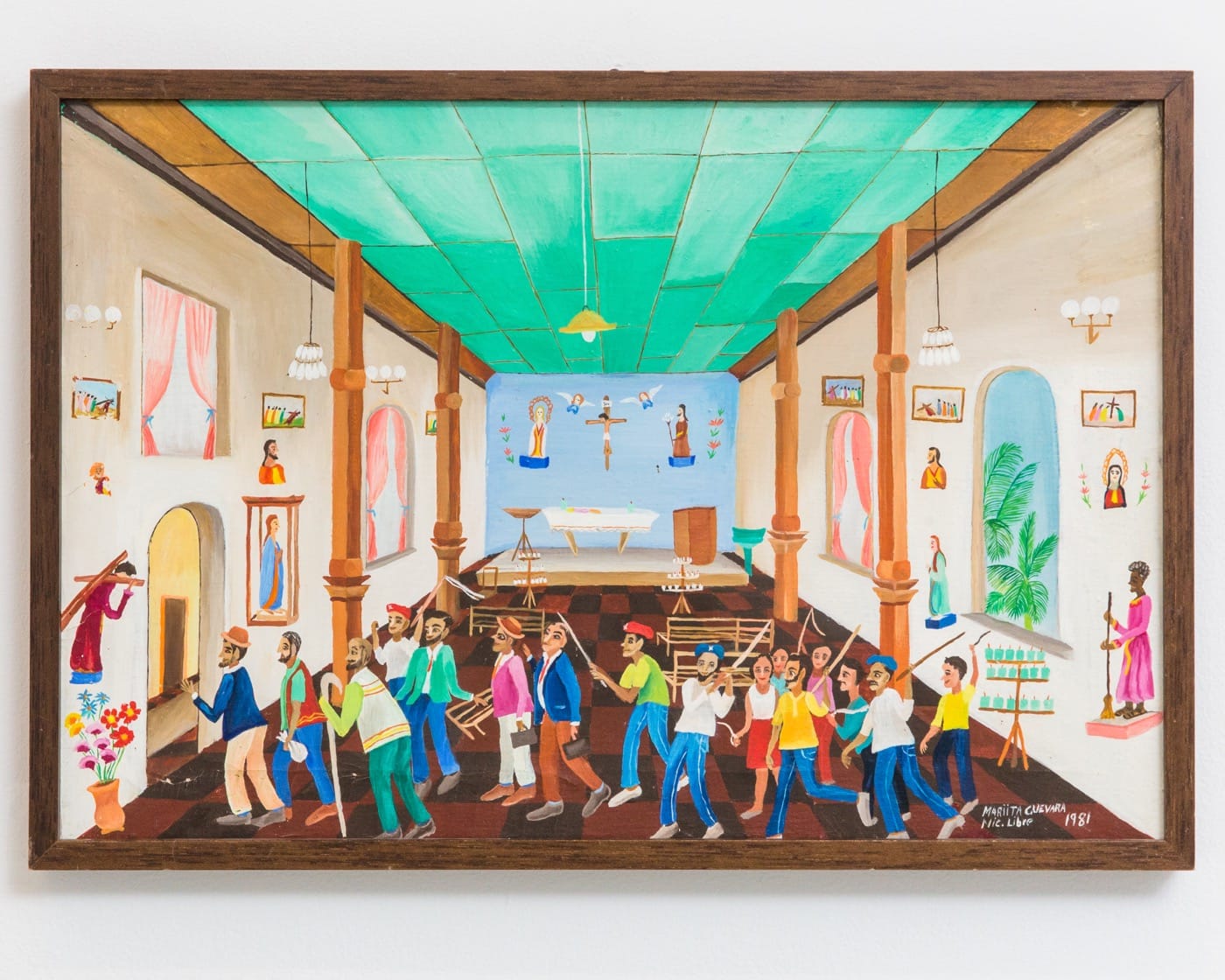 Cardenal also encouraged creative community activities at the chapel, including poetry, music, and especially painting. Painter Róger Pérez de la Rocha conducted a series of workshops with the peasants, who produced a distinct style of Primitivist painting, examples of which are displayed in the exhibition. The paintings depict biblical events transposed onto the reality of Solentiname, connecting Christ’s suffering with the community’s struggles — violence, torture, and censorship — during the dictatorship. The painting “Jesus Expels the Merchants from the Temple” (1981) by Mariita Guevara depicts the revolutionary peasants expelling the counterrevolutionaries from the interior of the Solentiname church. “The Beheading of John the Baptist” (1981) by Esperanza Guevara shows Jesus Christ alongside peasants and figures from the revolution, such as Cardenal and the leader César Augusto Sandino, who used guerrilla tactics against the U.S. Marines to force them to leave in 1933 after the U.S. had begun occupying Nicaragua in 1912. The painting “Jesus in Front of Pilatus” (1984) by Pablo Mayorga also represents Jesus Christ as a peasant, while Pontius Pilate is portrayed as Anastasio Somoza Debayle, the de facto ruler of the country from 1967 to 1979 and the last member of a dynasty that had been in power since 1936. These paintings were conceived as easily understood allegories and thus serve as agitprop for the Sandinista revolution.
