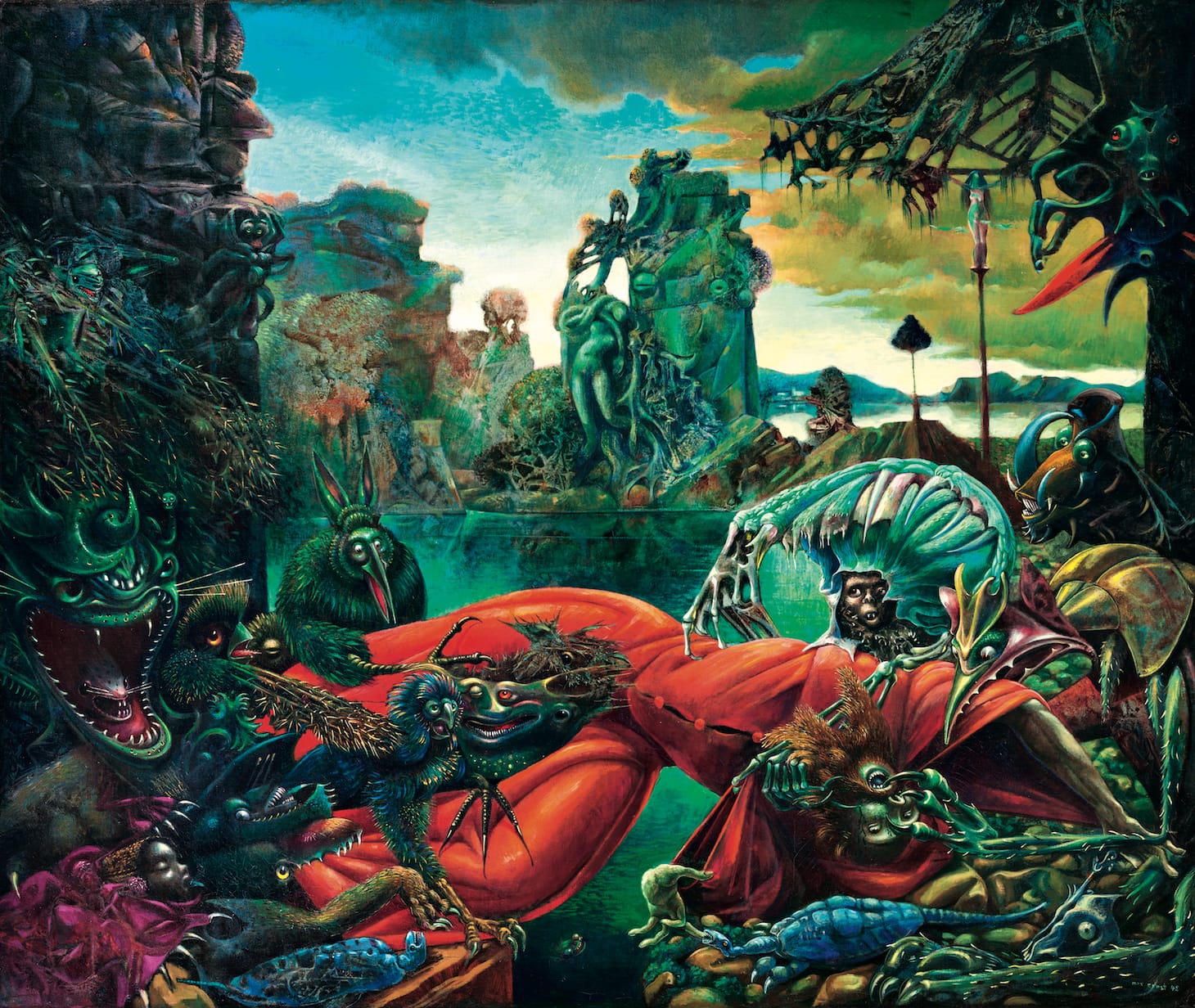With the western secularization that began with the Enlightenment, the meanings and representations of the devil shift again. He becomes a metaphor for human evil, with fewer religious connotations, the “diabolical more than the demonic.” The story of the temptation of St Anthony continued to serve as inspiration into the 20th century, after the devastation of nuclear warfare in Japan. Salvador Dali’s 1946 interpretation, “The Temptation of St. Anthony” (1946) conveys a wasteland on which black clouds encroach and grotesque horses and elephants loom over a frail, naked kneeling Anthony. In Max Ernst’s 1945 painting of the same title, demons overrun the canvas terrorizing the saint. Their deformation suggests the effects of radiation as Ernst “shows us a form of evil capable of… turning nature into a hostile all-devouring monster.” In both Dali and Ernst’s interpretations hell is here on earth created by our own hands.