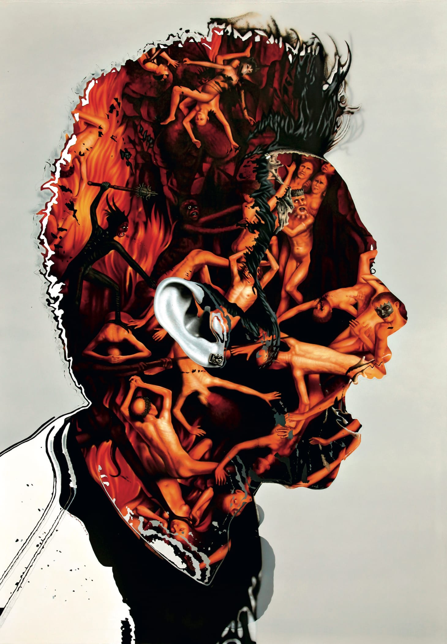 Elsewhere, Paparoni illustrates how the devil’s association with sex, deceit, charm, and hedonism has also made him a perfect reference for Hollywood’s glamour and artificiality. Pierre et Gilles’s painted photographs of subjects like Jeff Stryker and Marie France in glittery horns emphasizes how the images of the devil in the collective imagination have morphed from being informed by an earnest belief in his existence to reflecting a hyper-awareness of his symbolic meanings and a desire to satirize clichés. Works like Gary Baseman’s Garden of Earthly Pleasures series depict the devil with all his sexual and anthropophagous impulses, except he is a chubby three-legged, arrow-tailed, horned thing cute enough to be a collectible figure.