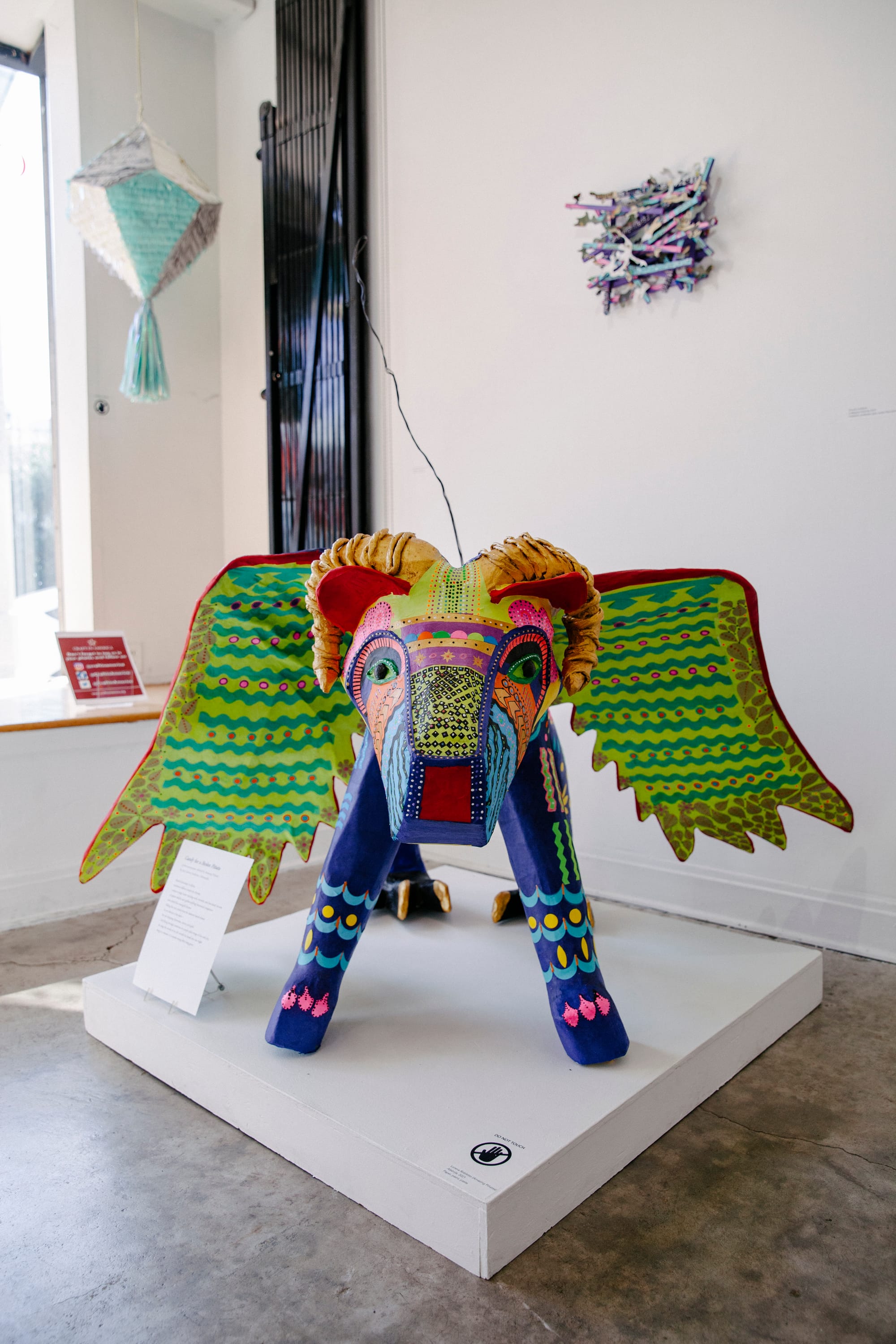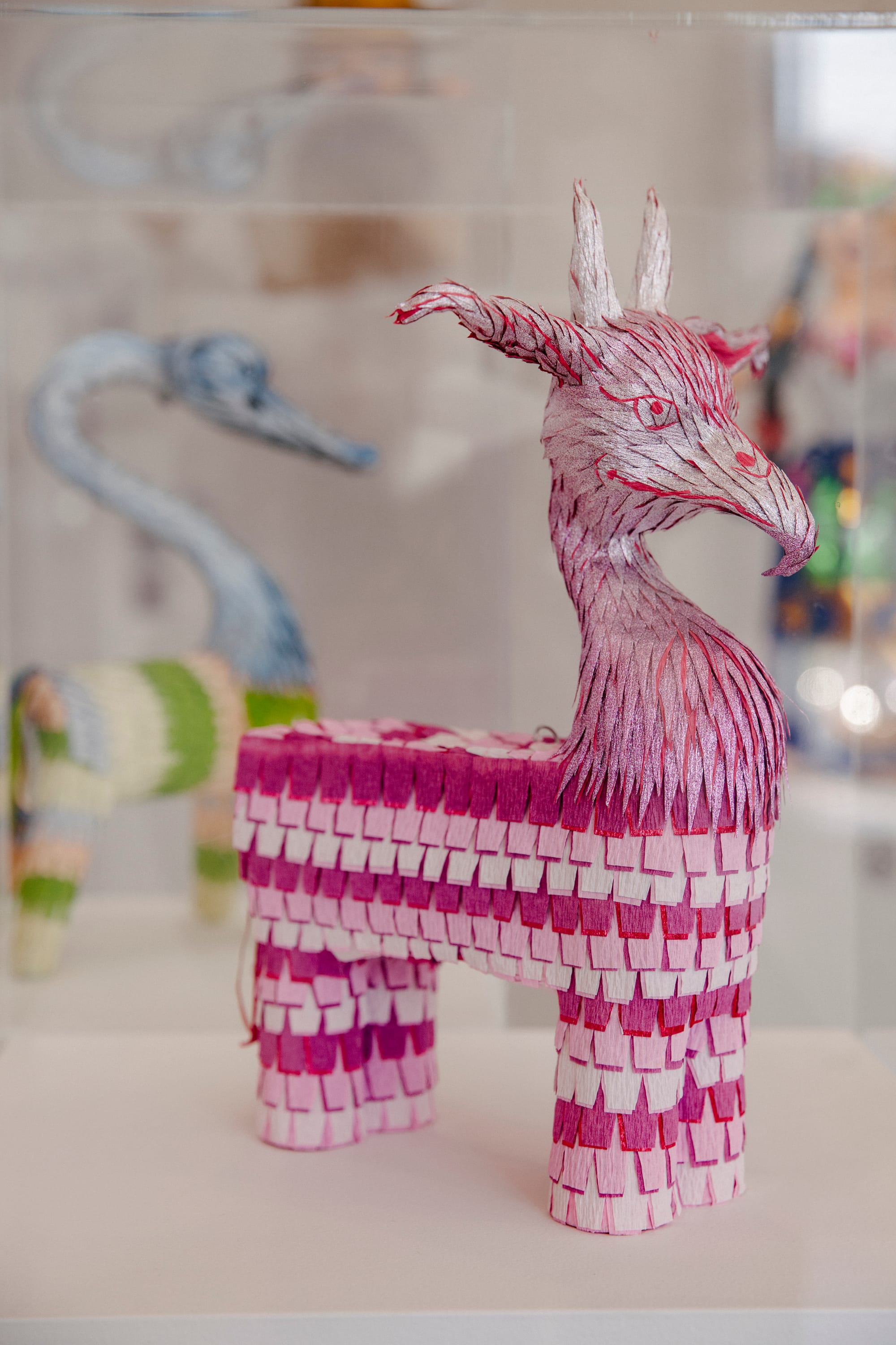Traditional piñata makers and artists recontextualize the art form and present a wide array of figures from COVID-19 vaccine piñatas to cheeky interpretations of abstract art like Roberto Benavidez’s Piñathko series, an ode to Rothko. Benavidez’s talent is most poignantly displayed through his series of fantastical animals reminiscent of Mexican alebrijes which have a colorful luminescent quality by way of an intricately cut and applied mix of metallic and tissue paper.
