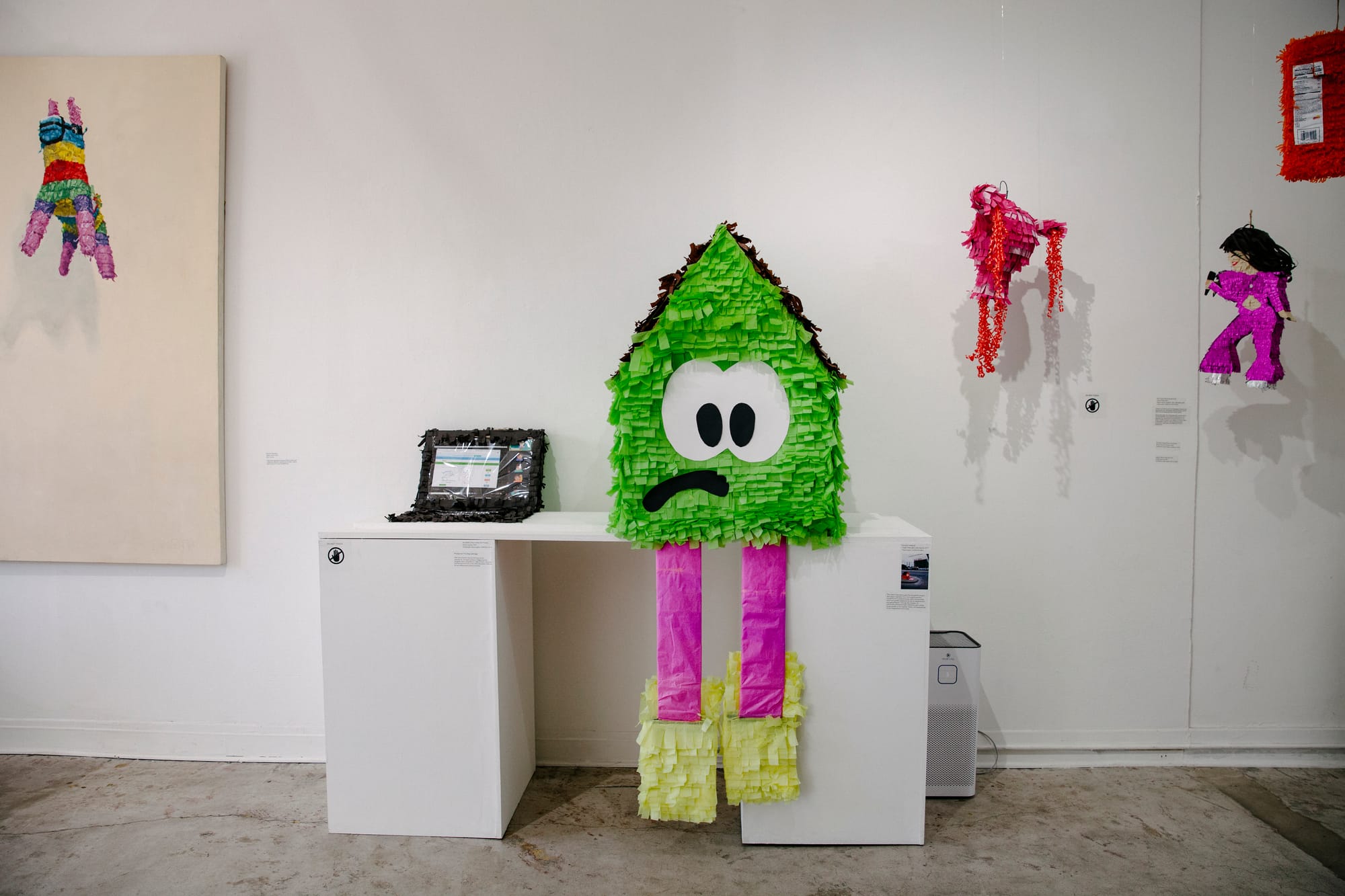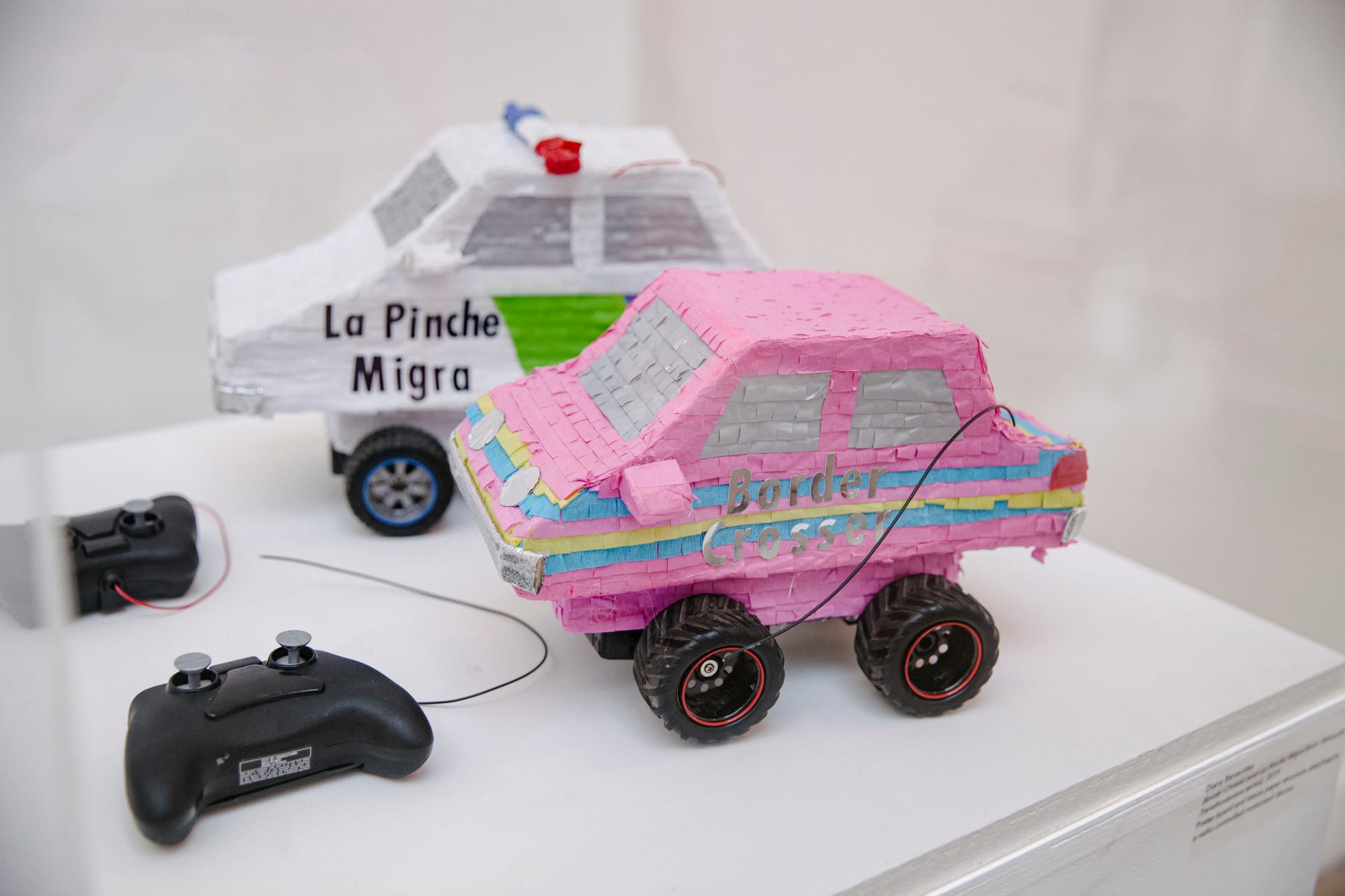 While piñatas have long been used as a form of practical social commentary (think the proliferation of Donald Trump piñatas during his presidency), Giovanni Valderas takes it a step further through site-specific placements of piñatas in the shape of sad-faced houses — a comment on gentrification and the displacement of Latinx communities. Diana Benavidez engages the US–Mexico border through the series Vehiculos Transfronterizos; motorized piñata cars carry messages like “Border Crosser” and “La Pinche Migra.”