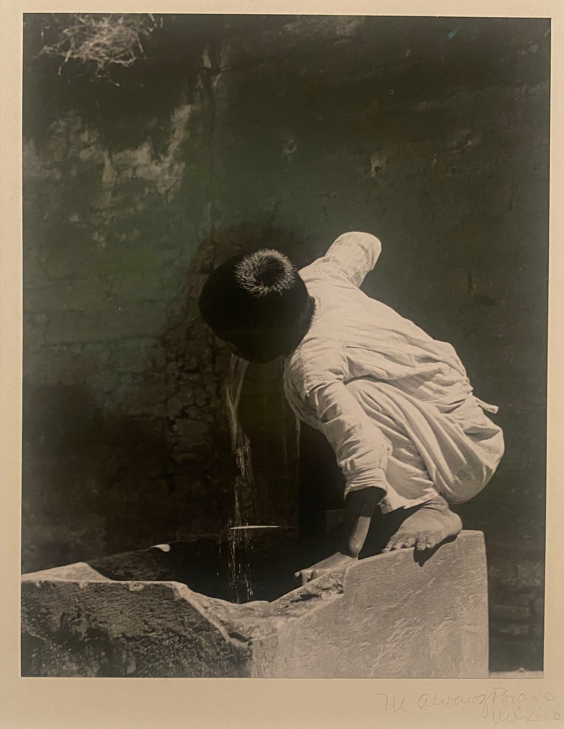 The show carries us home to 20th-century California, the US’s largest food-producing state, with photographs by Manuel Álvarez Bravo and Edward Weston displayed on a single wall. On one side are Weston’s aesthetic depictions of farming, like a gorgeous black and white pepper curled up as if in a yoga pose and a Chinese cabbage with yonic qualities. On the other side are Álvarez Bravo’s portrayals of farmworkers and their families, such as “Public Thirst (Sed pública)” (1934), where a child drinks water from a fountain, and “The Crouched Ones (Los agachados)” (1934), which shows farmworkers taking a break during the day to eat.