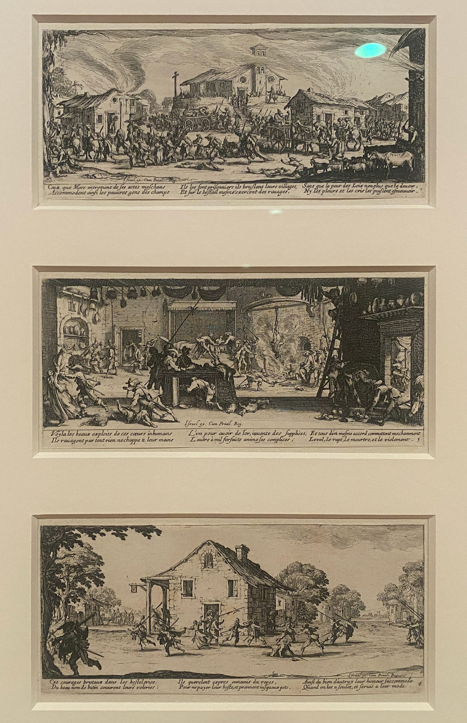 Consider, for instance, Les Grandes Misères de la Guerre (The Miseries of War), a triptych of panoramic etchings by French artist Jacques Callot that depict pillaging a village and a farm. The misery shown is not battle but the violence the war normalized among underpaid and hungry soldiers. “In the 17th century,” the exhibition text states, “plundering was considered a legitimate wartime practice, as controlling resources, especially food, was essential to military success.”