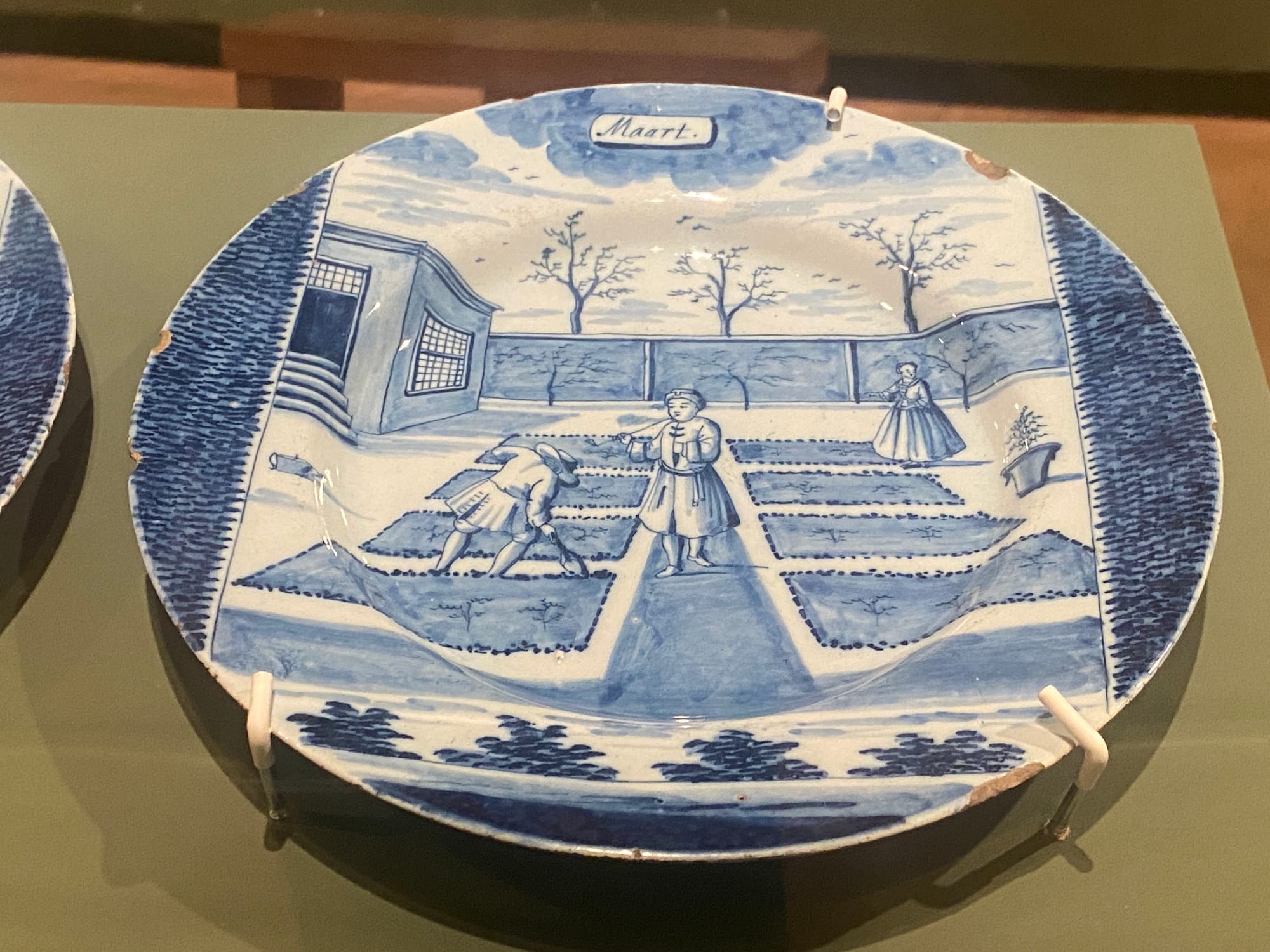 Contrast this act of violence with “Twelve Plates from a Calendar Set” (1739–75), a collection from ‘de Porceleine Bijl' Shop and Hugo or Justus Brouwer. These 12 beautiful plates, made in blue-and-white porcelain fashionable in the 18th century, and meant to mimic Chinese porcelain, show idyllic activities themed for each month, such as harvesting fruit in September and supervising gardening in March. The plates, like “Still Life with Fruit and Vegetables,” display scenes that were made possible by significant colonization abroad.