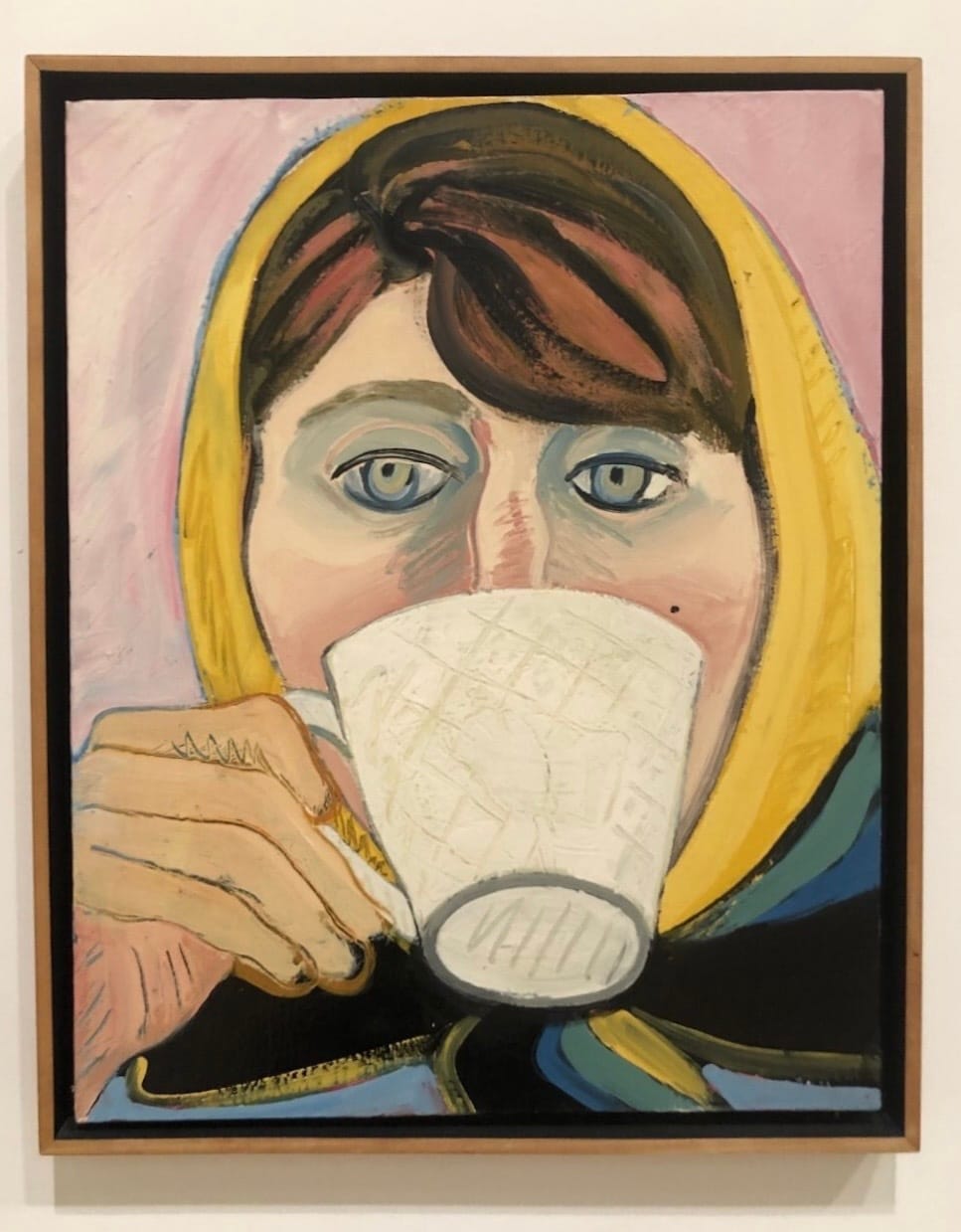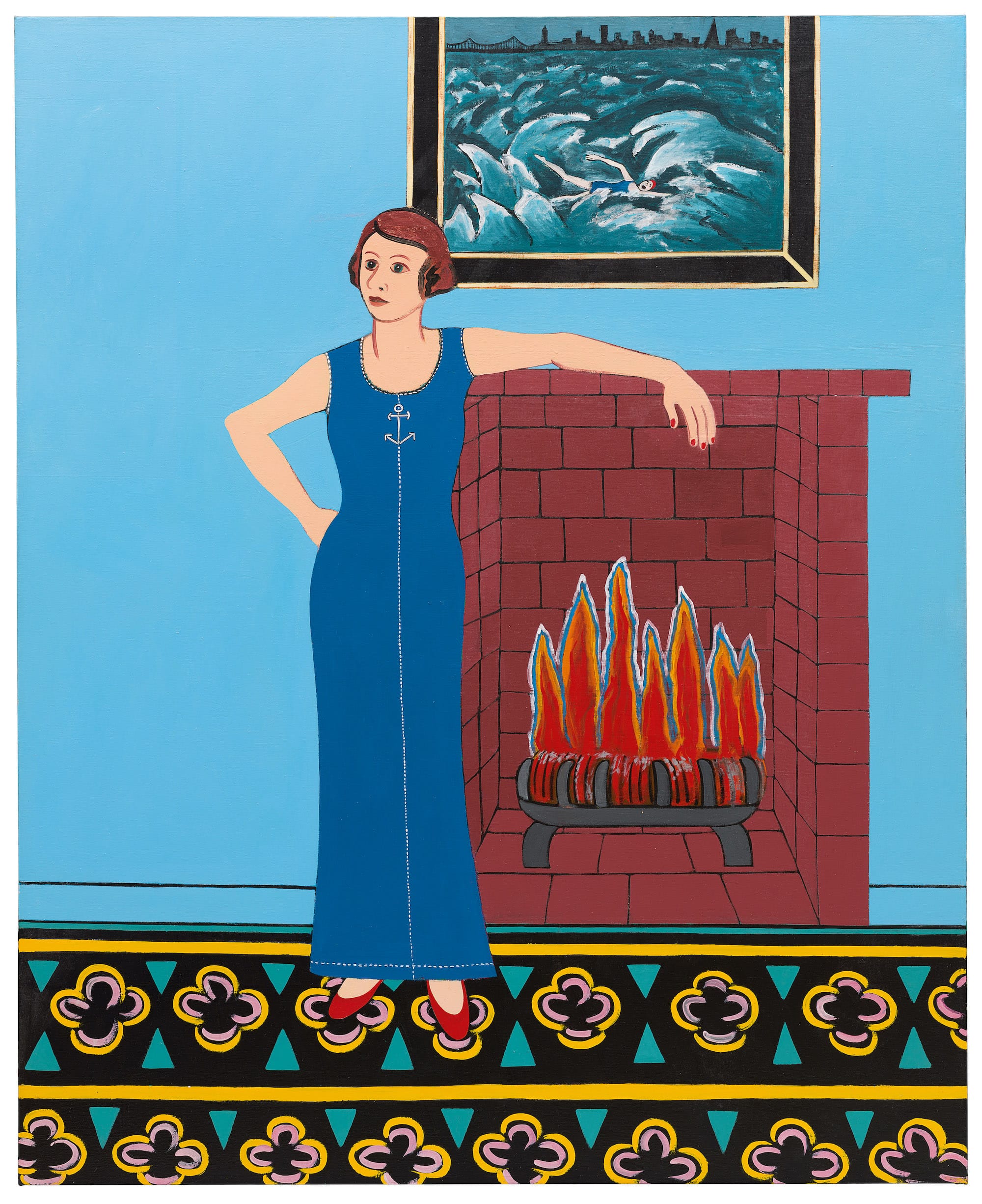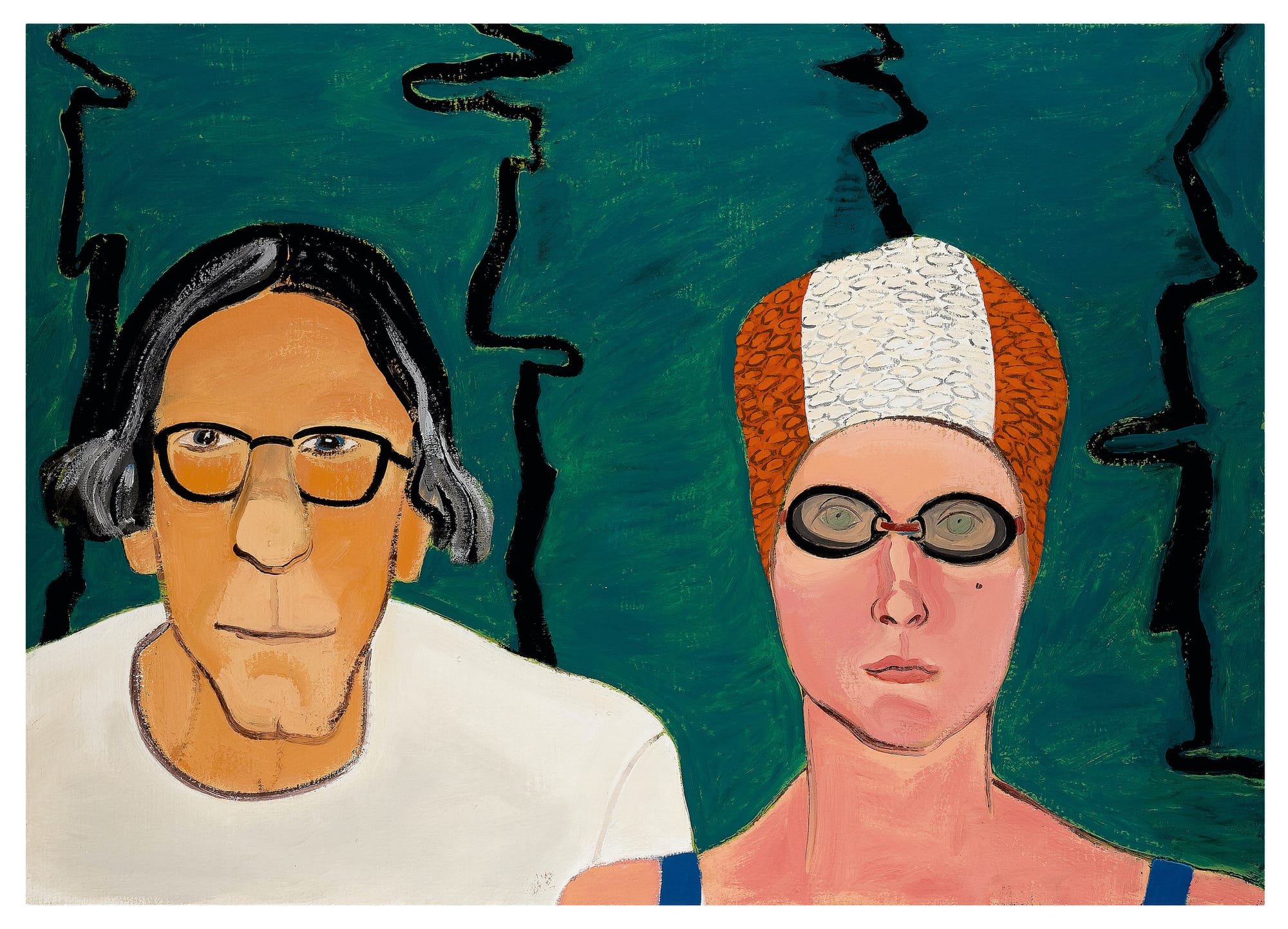 Which is not to say her mature style didn’t produce wonderful paintings, particularly the self-portraits, some as ageless as any Egyptian Fayum mummy, even with a teacup to her lips; or Brown’s dual portrait with her swim coach, Charlie Salva, deities of their pool domain; and the large paintings commemorating her dangerous Alcatraz swim with wry energy and heroics.