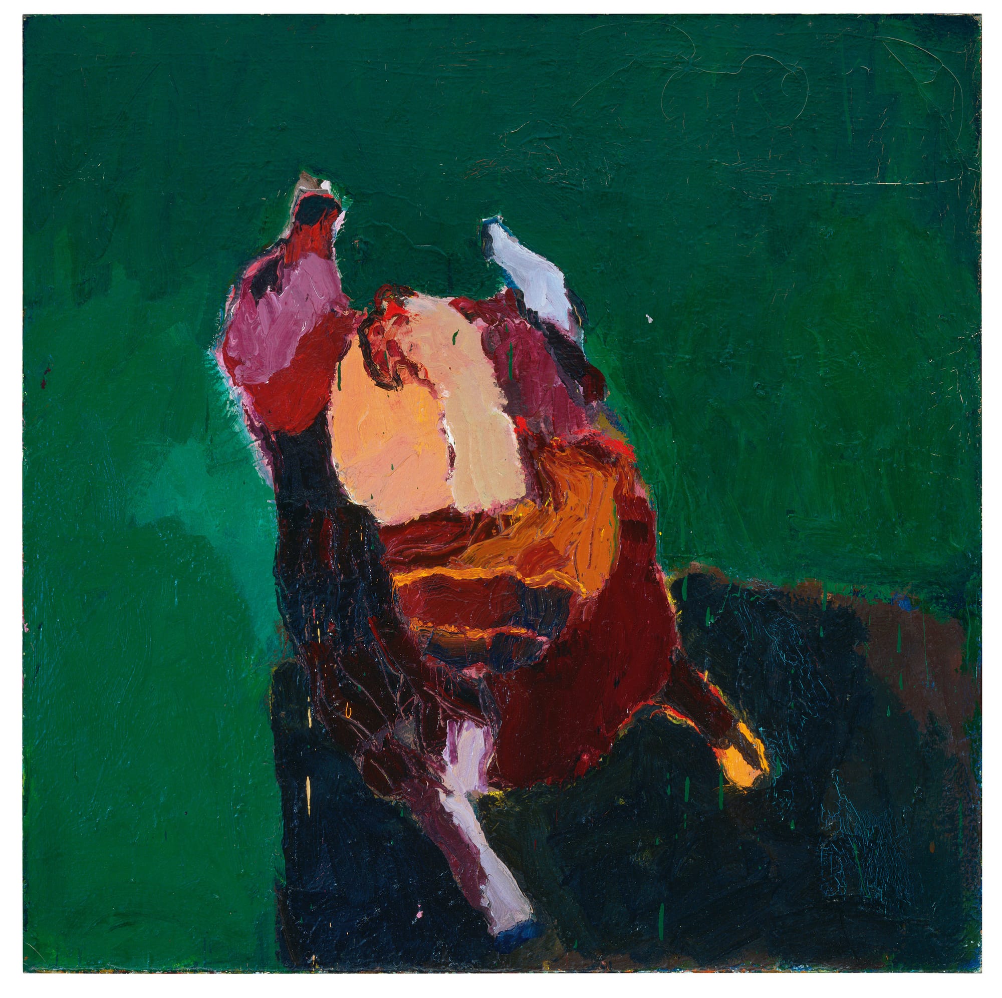 Brown’s early success led to dissatisfaction, as much with the art market as with what she was making. She resented the easy commodification of her work, and the incessant demand for her to create something just so others could own it. She also began to feel dishonest in producing painterly gestures that implied spontaneity, whether true or not. In short, her motives were pure. But the pivot to stiff figuration and flat color planes is for me nearly as off-putting now as it was for critics in the late ’60s.