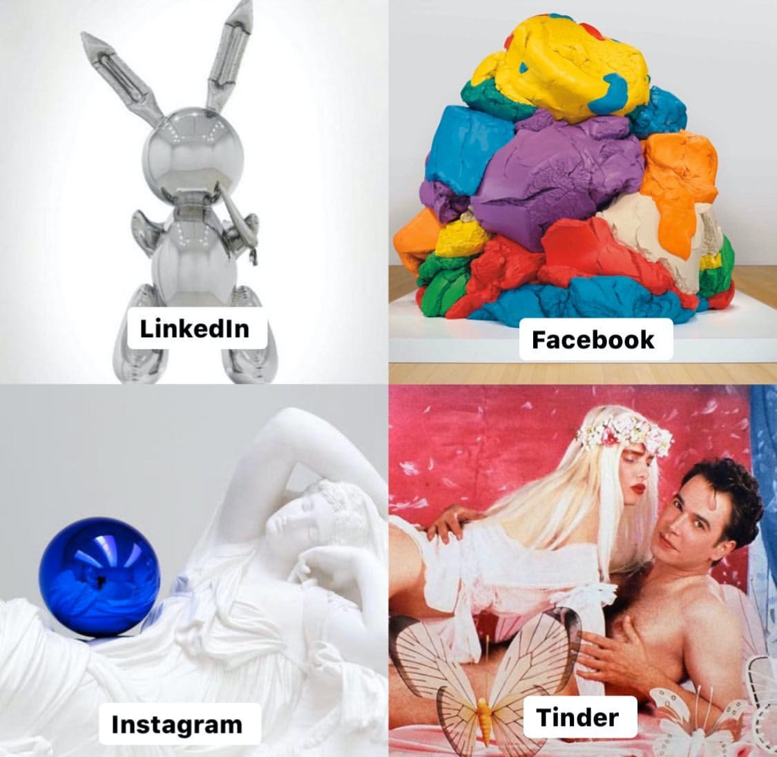 And, since art is but an imitation of life, museums, auction houses, and artists have stepped up to the challenge, too. “Get you a museum that can do it all,” said MFA Boston and London’s Natural History Museum in the captions to their Dolly Parton memes. Two versions by the anonymous Instagram account and art world éminence grise @JerryGogosian flaunt the many guises of Klaus Biesenbach and Larry Gagosian; another tells a brief history of Jeff Koons’s career, from shiny, high-powered $91 million rabbit sculpture (LinkedIn) to shapeless mound of Play-Doh (Facebook, obviously.)