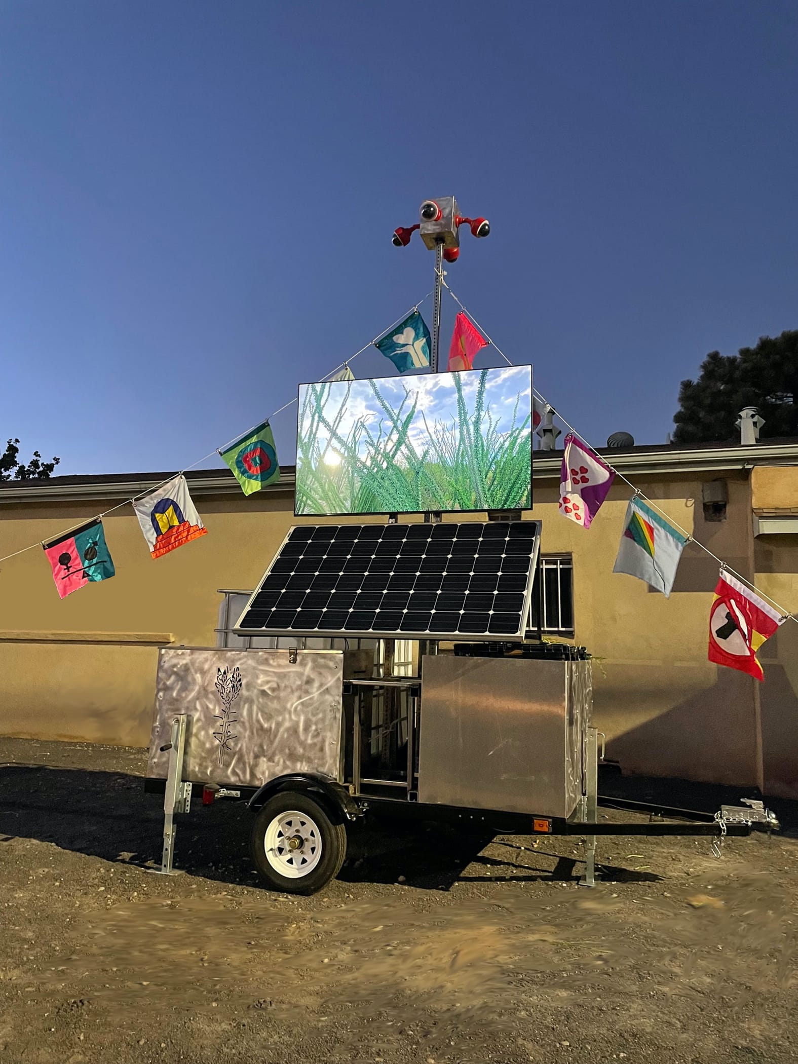 Transformation is not just an idea or conceptual framework for crider, it’s a physical act. For example, “TransVEIL,” which she created in collaboration with Obie Weathers III, who is currently facing the death penalty in Texas, is a mobile surveillance trailer converted for mutual aid (think water and local food). For her series NonTactical Monuments, she transforms policing equipment such as border patrol rescue beacons to address “our limited conceptions of safety, crime, and punishment.” According to US Customs and Border Protection, “the rescue beacons provide the capability for a migrant to call for medical assistance or rescue while automatically providing a location. Rescue beacons are self-contained, solar-powered units placed in remote locations considered to be high risk for people in distress.” Crider explained that in fact these units are frequently used to detain migrants. In her work they “become historical markers for the thousands of detention deaths” and “point to the vast machinery and technology deployed in mass incarceration.”
