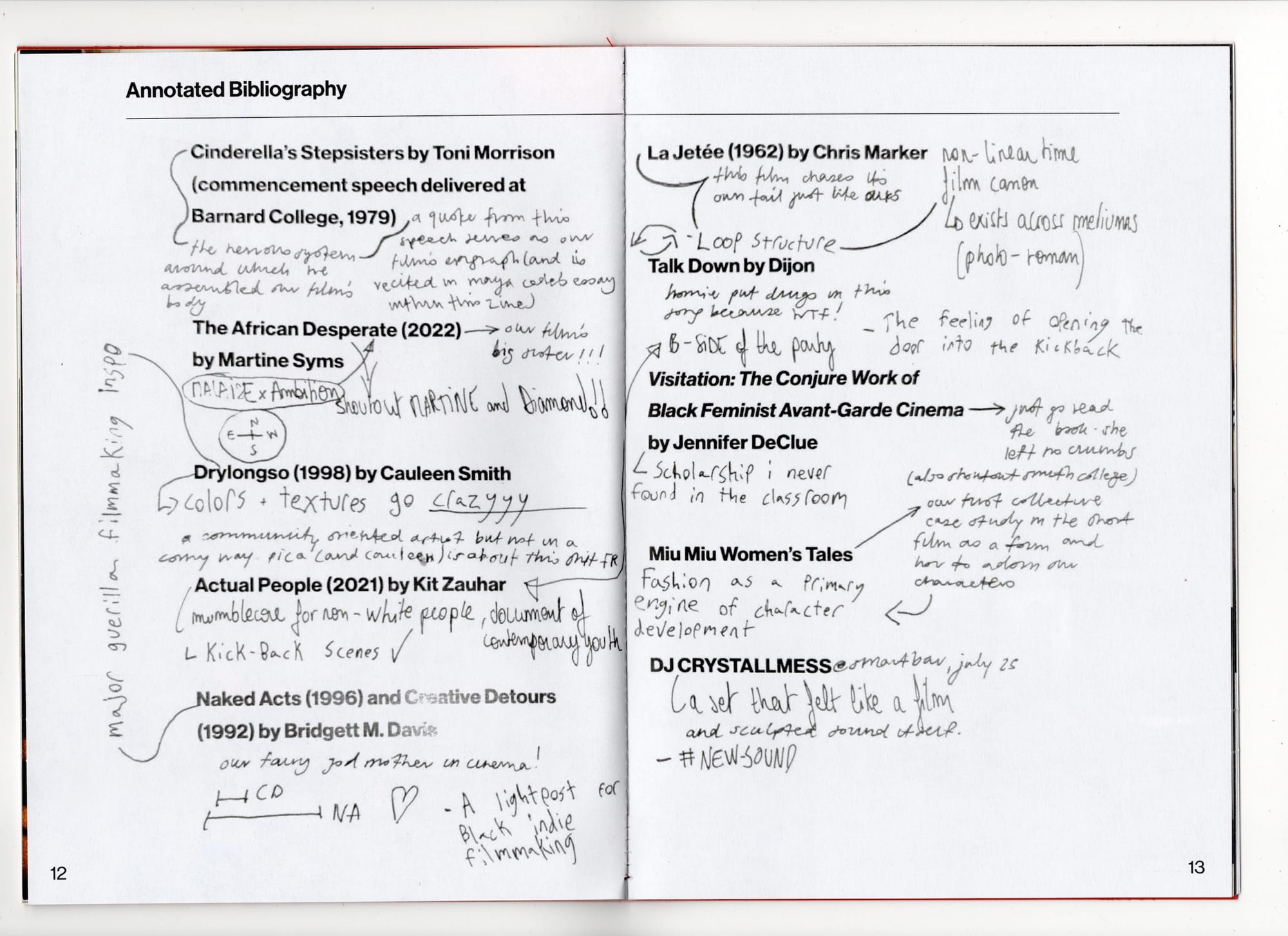 CB: We all saw Drylongso and Losing Ground, for example, and those two films in particular galvanized us to make a film that’s posing similar questions from a different vantage point. It felt really important to cite both Cauleen [Smith] and Bridgett [Davis] in the zine. I feel tremendous gratitude because I got to watch these films as a 20-something-year-old. I wish I got to watch them as a teenager and now, because of Maya Cade’s work, that’s going to be possible for future generations. We needed to celebrate that in the zine. More broadly, the zine speaks to the importance of a citational ethic, which we want to weave through everything we make. There are a number of texts that make cameos, including the catalog from Koyo Kouoh’s show When We See Us, Legacy Russell’s Glitch Feminism, and Tom Lloyd’s Black Art Notes. We filmed in the library at Tala Gallery, which was founded by our friend Francine Almeda. The casting process was also culled directly from the social architecture of our actual lives; we included people we love to think alongside. We’re in pre-production for our debut feature, which has already been such a glorious chance to deepen that approach to casting.