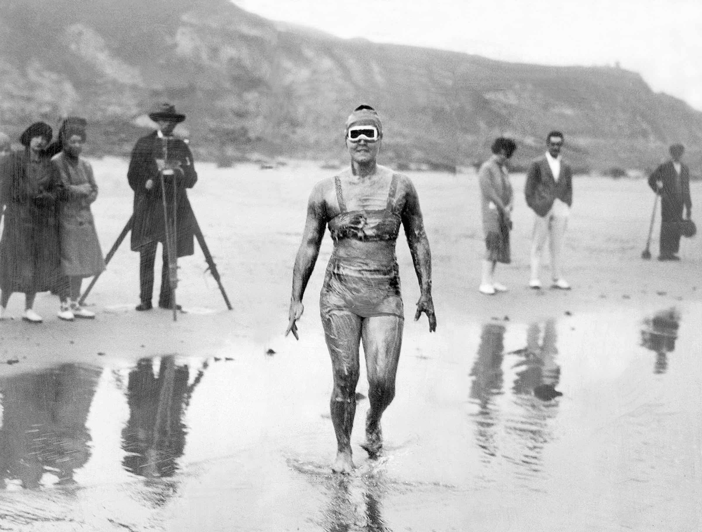 Take the case of Olympic swimmer Johnny Weissmuller, for example. What a magnificent hunk of a performer he was! Weissmuller, a five-time gold medal winner, became a Hollywood idol, starring in 12 Tarzan films. In a 1932 photograph by George Hurrell (not in the exhibition) for the Los Angeles Olympics Games, he posed as a Greek statue of a discus thrower. Unfortunately, he was so gorgeous to behold in this image that Nazi propagandists saw him as the embodiment of the ideal Aryan male. His physical perfection made him fodder for the Fascist propaganda machine.
