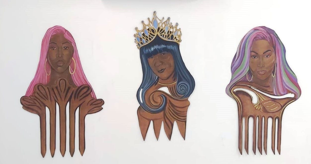 For his contribution, Coke foregrounded the musicians, DJs and dancehall dancers. In the acrylic painting “Dancehall Galaxy” (2017), four artists — Popcaan, Alkaline, Mavado, and Vybz Kartel — stand against a dark sky, almost like gods of the genre, orbited by vinyl records that seem to mirror planets. Coke’s work is a bold statement about the global influence of the artists, genre, and culture despite their marginalization in Jamaica.