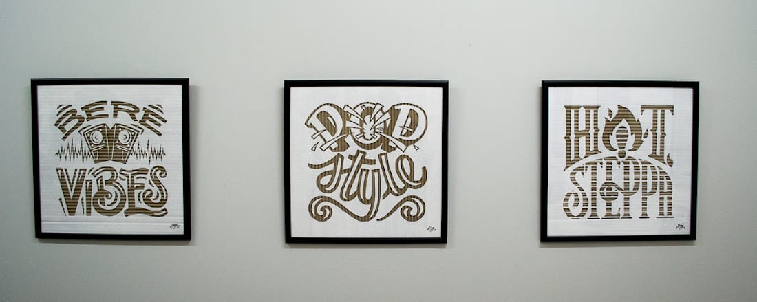 Inextricably linked to that subculture is its syntax. In Samantha Hay’s artworks “Bere Vibes” (2022), “Pop Style” (2022), and “Hot Steppa” (2022), phrases popularized by lyrics used within the genre are carved into recycled cardboard. The works reflect the dynamism of Jamaican Patwah, as do Achim Clunis’s set of printed illustrations and handmade wooden phrases and words that draw on dancehall’s vernacular. While the Caribbean is not often associated with typography, Clunis’s is a direct expansion of the region’s own growing collection in a vein similar to that of noted Negril-based sign painter Nurse.