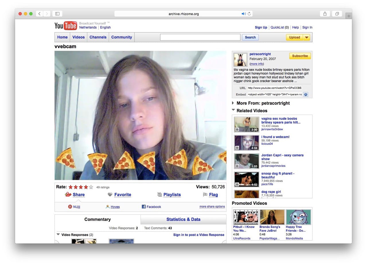 This sense of risk permeates mainstream stories about the dark web: If you search for “Tor” on Google, some of the most frequent searches are “is Tor illegal?” (answer: no); “do hackers use Tor?” (Yes); and “is Tor dangerous to use?” (generally, no). This unsafeness attracted the attention of those artists and creatives who critically focus on the study of digital tools. At a certain point, Facebook, Google, and the other big online platforms allowed less and less freedom to what creatives could do on them. An example of this occurred in 2007 when works uploaded by artist Petra Cortright on YouTube were deleted by the platform in 2010 because the key words she used didn’t follow the company’s guidelines and could lead viewers to content they weren’t looking for.