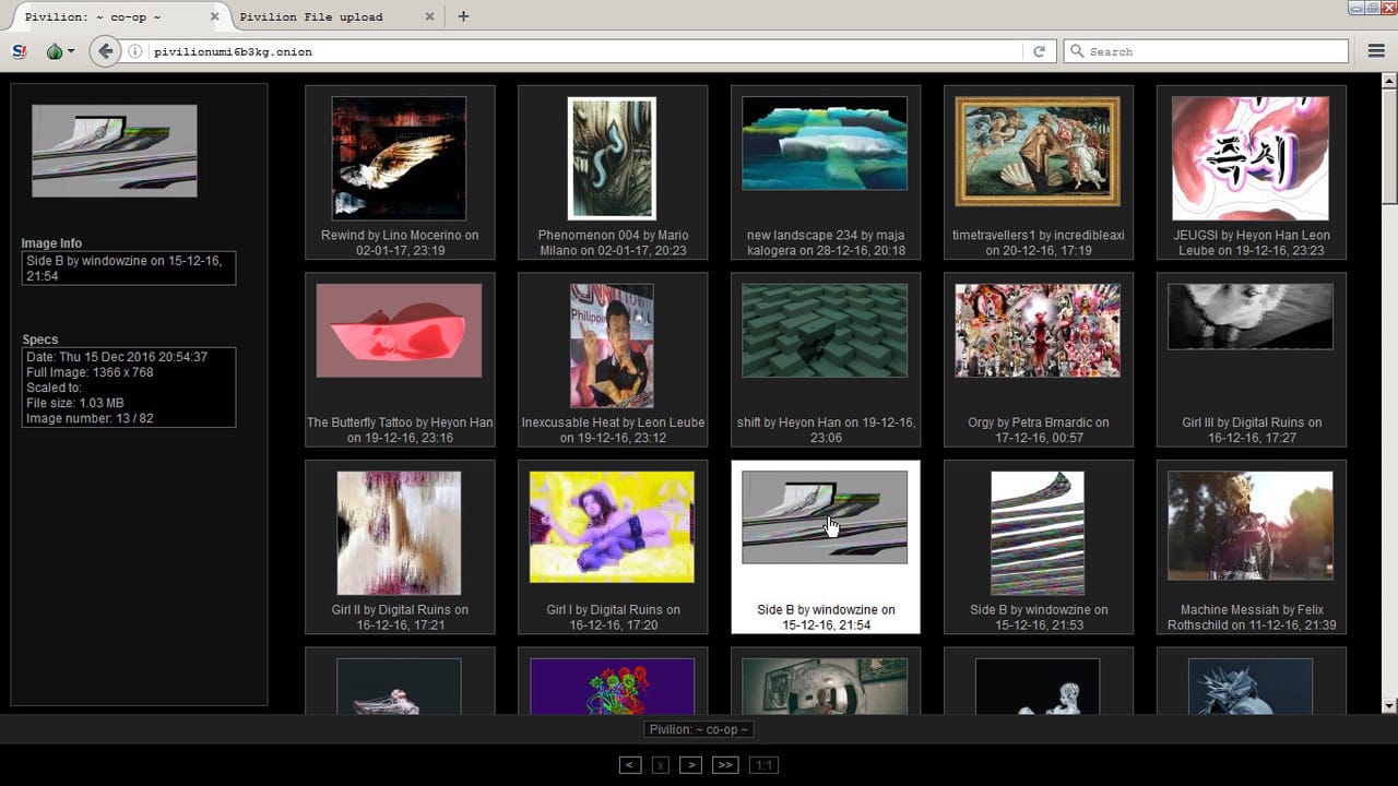 This interest in working in contexts that have not yet been permeated by the market-driven logic of corporations or by governmental control resembles certain aspects of the first phase of modern urban gentrification, namely artists seeking out the areas that allow them to work with more freedom and less financial cost than the busy, hyper-capitalized districts where most people live and socialize. It is exactly the importance of alternative means of production and display that led artists Dina Karadžić and Vedran Gligo in 2015 to open Pivilion, a gallery located in the dark web where visitors can find contemporary art works that would have otherwise been censored in other public exhibition spaces. Thanks to its decentralised structure, which has no central authority carrying out regulatory action, the dark web offers the artists a degree of freedom and anonymity that commercial galleries and traditional cultural venues simply can’t match. This is an untold contemporary art history that draws my attention because its developments are difficult to record given the platform where its key actions have taken place.