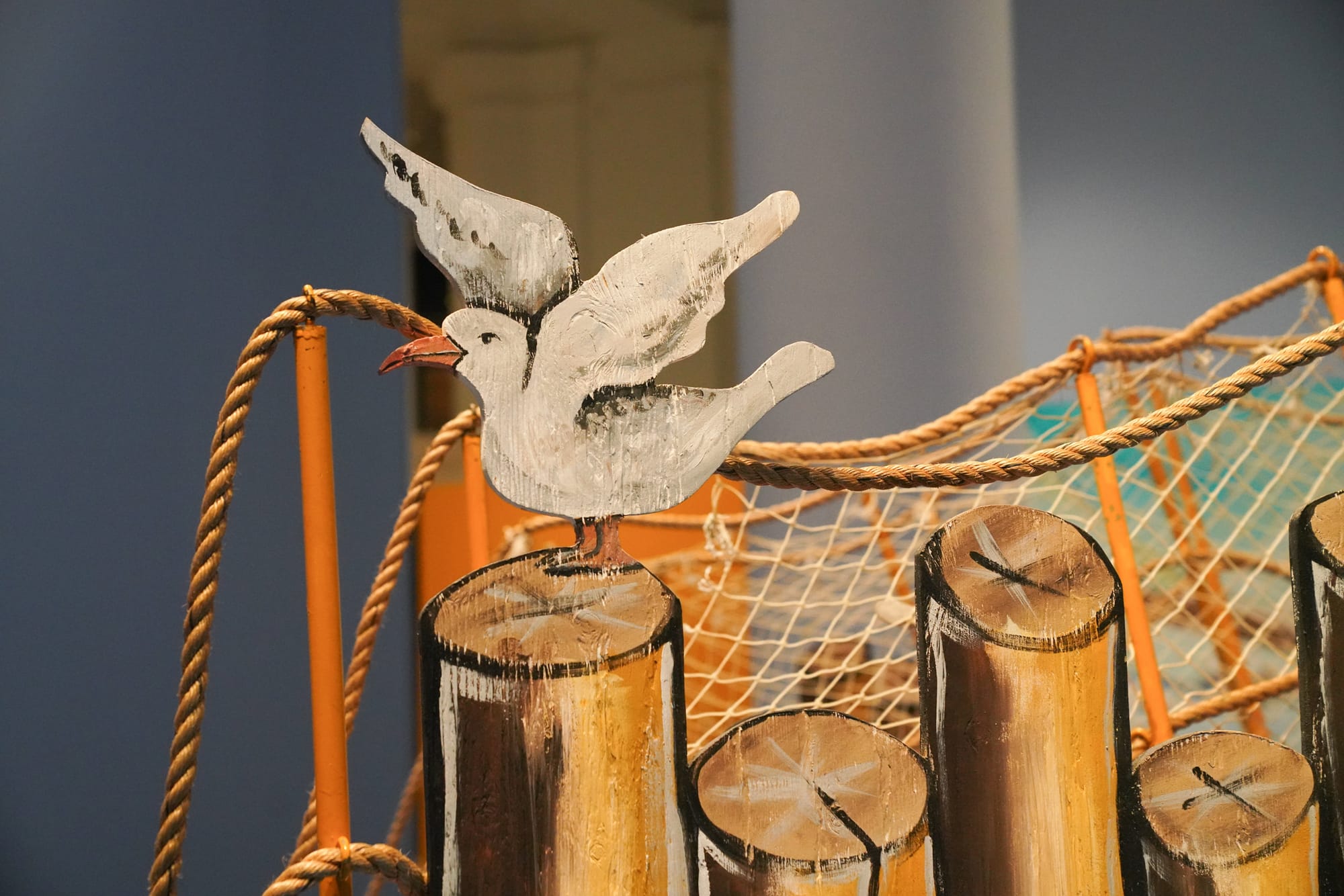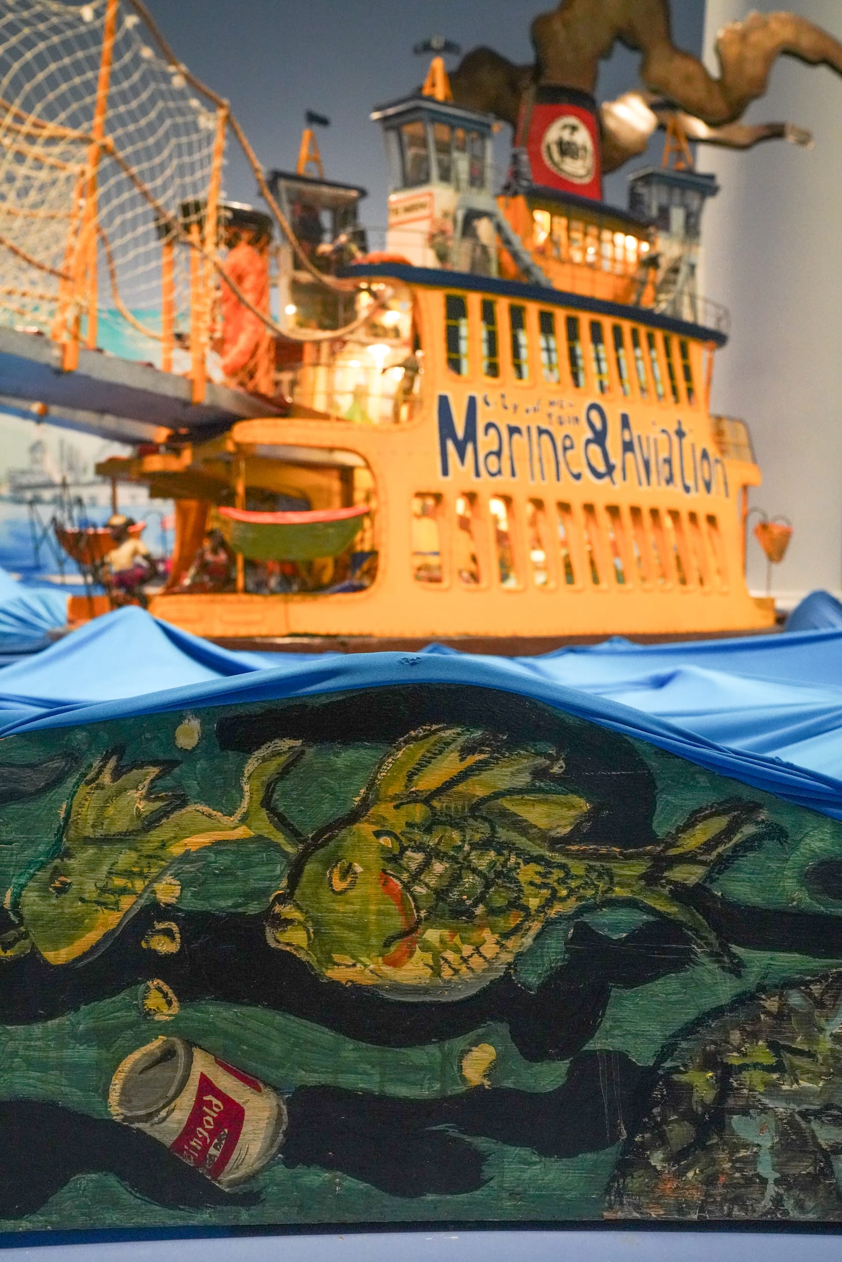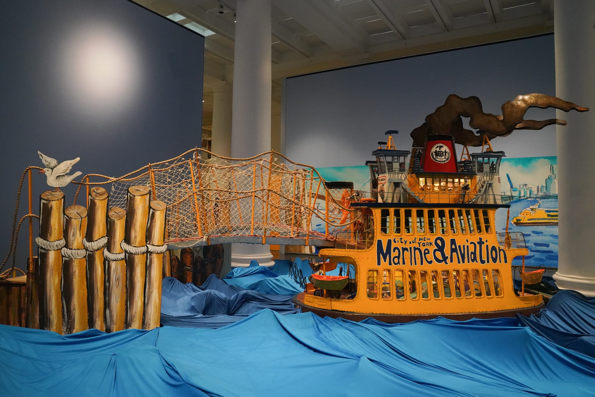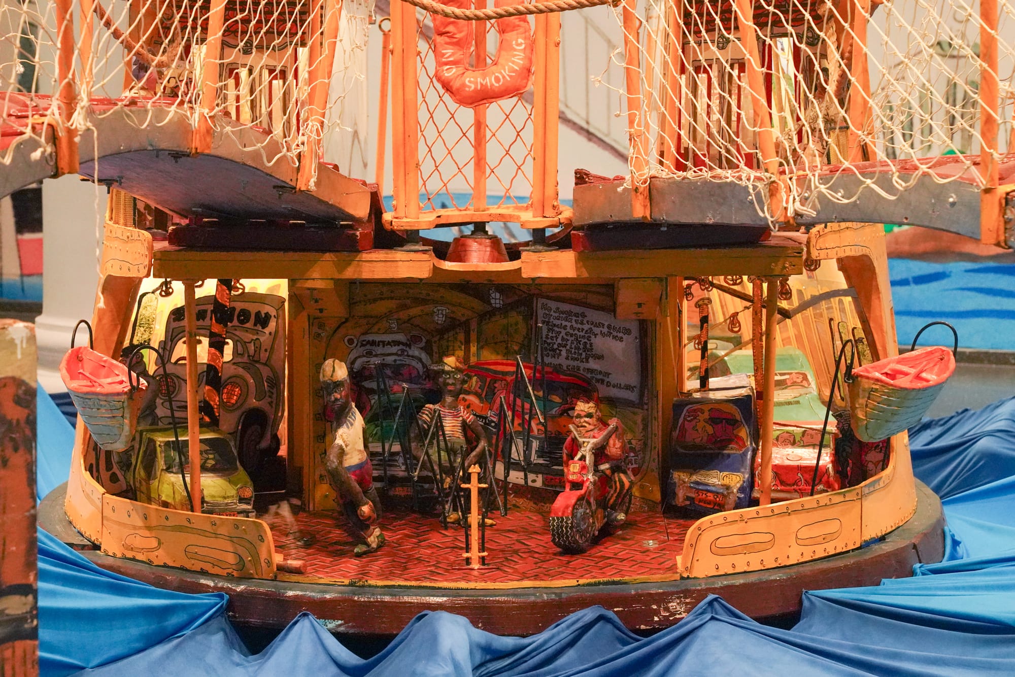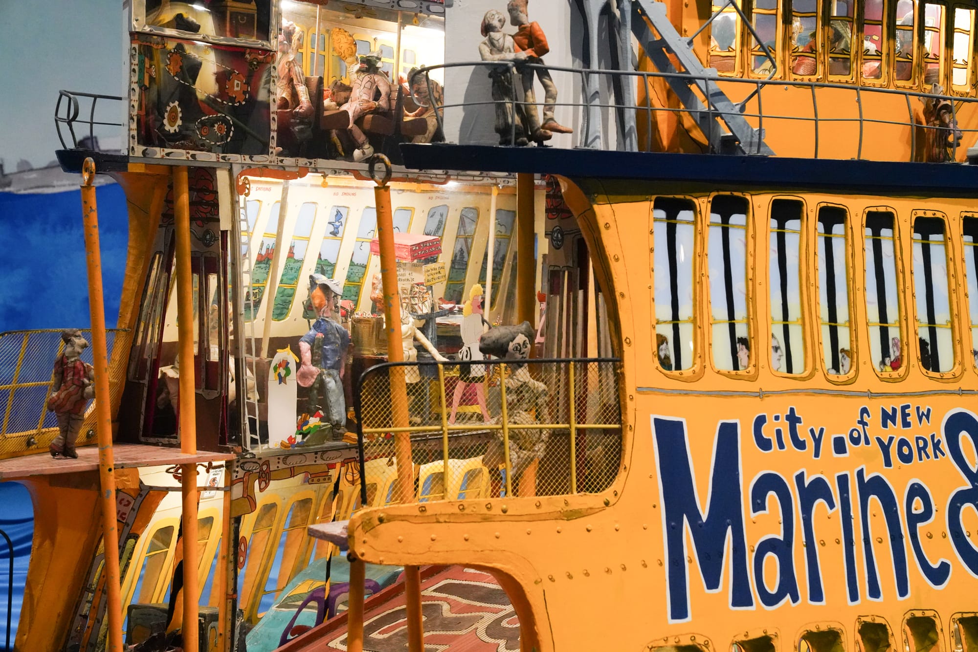 The first gallery, lined with Grooms’s scaled-up watercolored scenery, holds “Dame of the Narrows” (1975), in which a marigold Staten Island ferry floats atop a wavy blue fabric waterway. A message painted across the vessels’ floorboards invites visitors to “step aboard.” In the ’70s, you could traipse through the boat’s interior and explore the art up close, with its sculptures depicting a cross-section of passengers and crew playing cards, visiting the snack bar, and looking out at the skyline. To protect the structural integrity of the artwork, that’s no longer allowed. Now, the ferry’s entrance is blocked off with a warning: “No stepping.” You can still view the “Dame” at a distance, but most of the innards remain just out of sight.