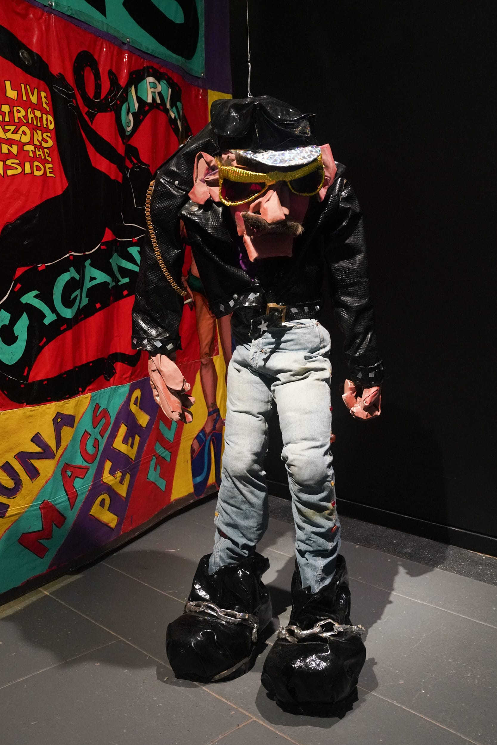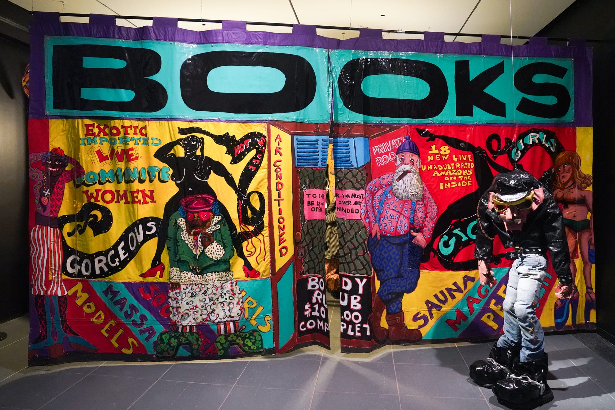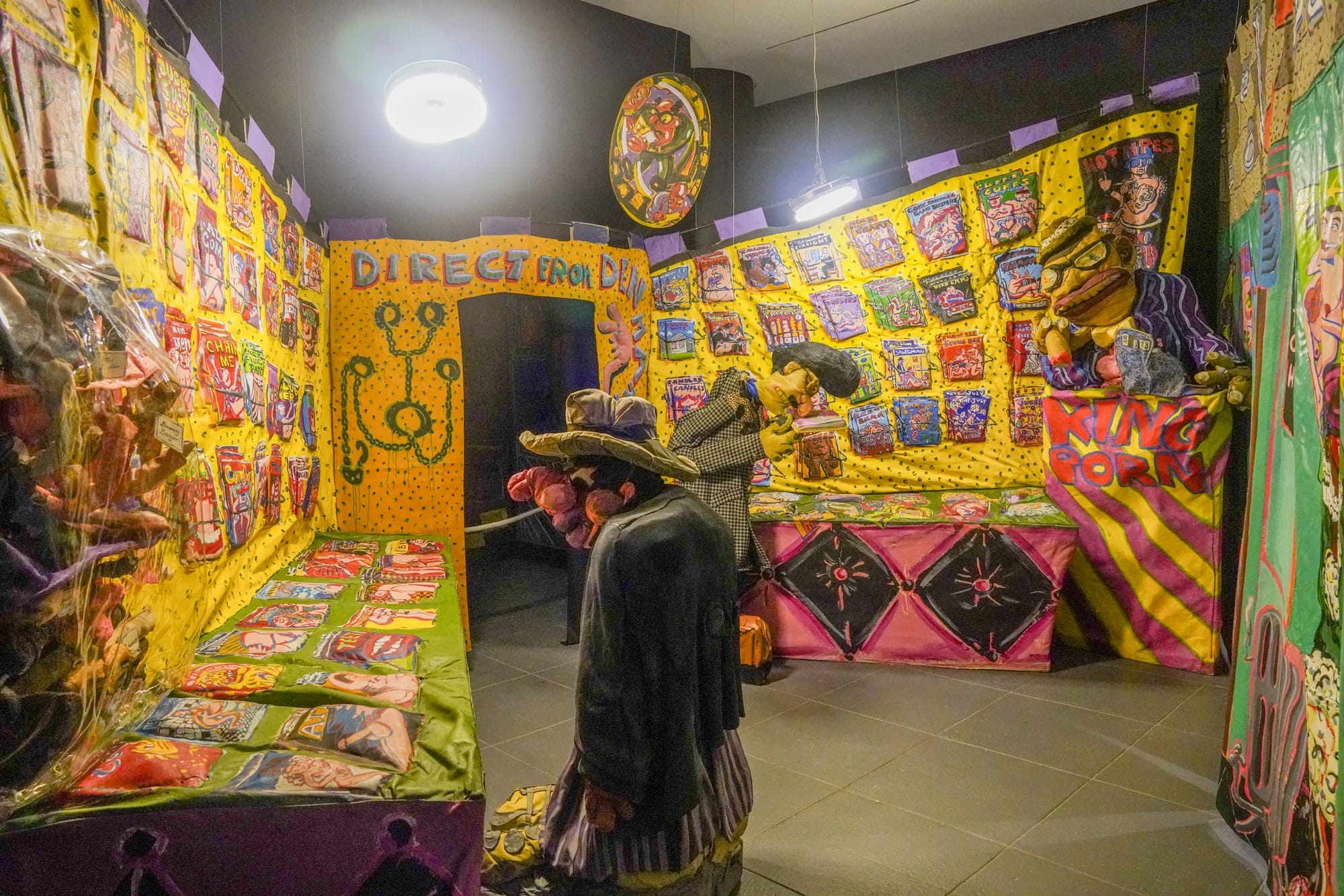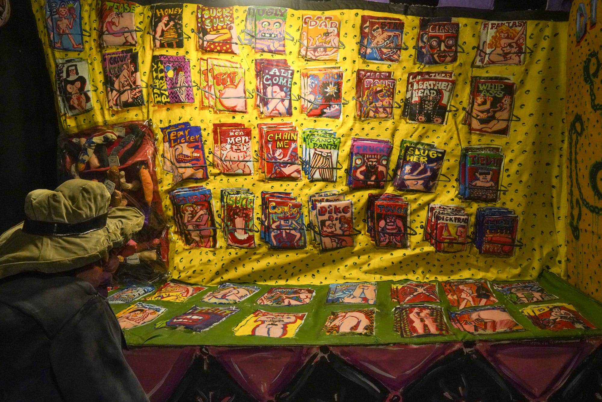 The neighboring gallery retains the original interactive spirit with “42nd Street Porno Bookstore” (1976), a humorous riff on the seedy sex shops and adult entertainment venues that filled Times Square in the ’70s, before the area became a hotbed of supersized chain restaurants and off-brand Elmos. The shop’s facade advertises books, “girls,” and “hot stuff.” A hand-painted pink sign notes, “To enter, you must be 18 or over and open minded,” and exhibition signage warns of sexually explicit content. Inside, the bookstore’s yellow walls are crammed with homespun porno magazines bearing bawdy titles that range from body focused (“Tit,” “Toesies,” “Fancy Pants”) to hilariously niche and absurdist (“Duck Suck,” “Hot Dog,” “Mounties”). On my Sunday afternoon visit, viewers lingered and giggled over the punny titles, snapping furtive photos and peering into the darkened backroom.