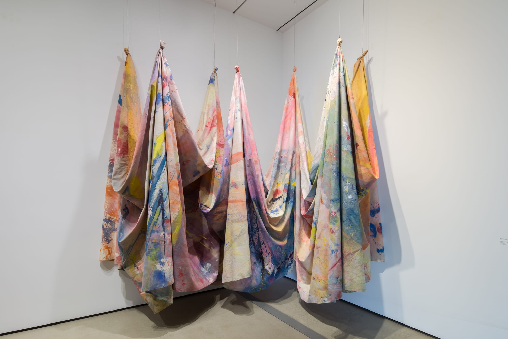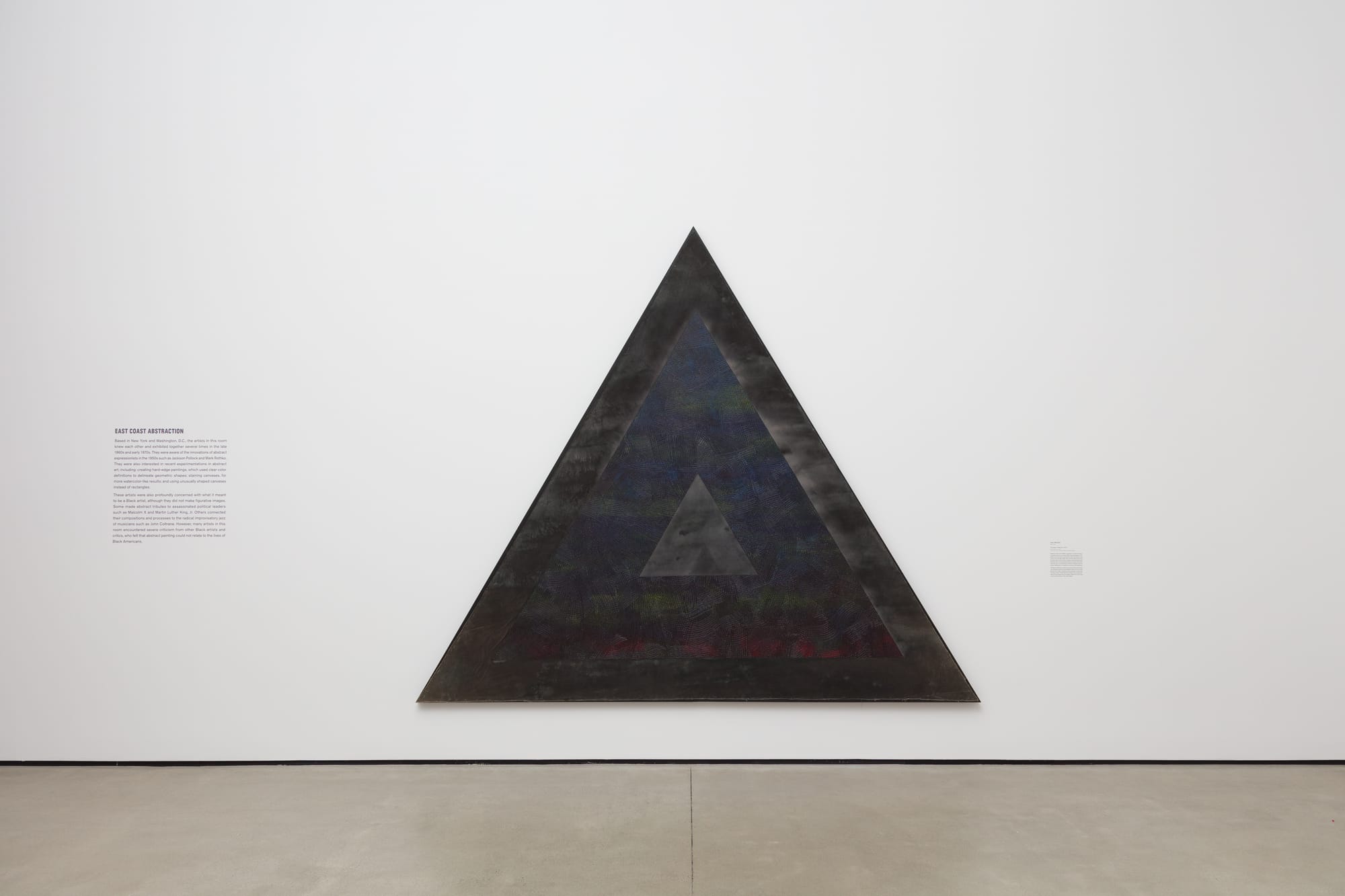 The Broad’s iteration of the exhibit devotes specific attention to abstract artists such as Jack Whitten, Sam Gilliam, William T. Williams, Alvin Loving, Alma Thomas, Joe Overstreet, and Howardena Pindell, whose works were received awkwardly or with hostility by other Black artists in those decades because abstraction was deemed insufficiently political. This despite the overt agenda possible in an abstract work such as Whitten’s “Homage to Malcolm” (1970), whose enormous size, black color, and triangular shape commemorate Malcolm X’s visit to the Egyptian pyramids in the 1960s. Pindell’s “Untitled” (1978), for example, is made from pieces of canvas sewn together and covered with paint, sequins, and countless paper dots made with a hole-punch. Her use of non-traditional, inexpensive materials evokes the way in which Black people, who generated America’s wealth first as enslaved people and then as victims of systemic exploitation, were shut out of the country’s largesse and had to make do with whatever materials were ready to hand.