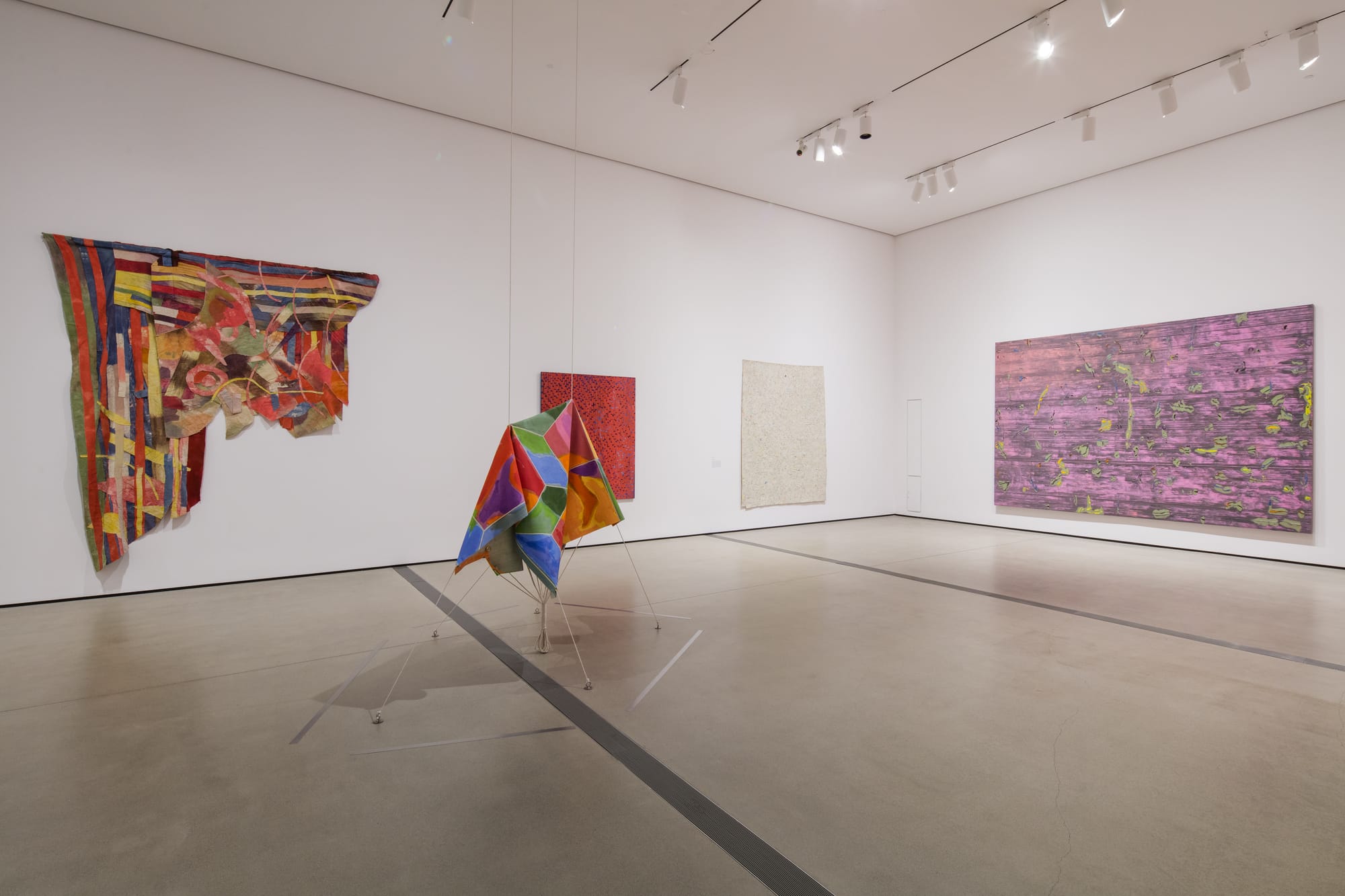 “We Came from There to Get Here” (1970) by Joe Overstreet, who recently died at age 85, might be seen as a colorful tent-like structure whose greatest significance was moving painting off the wall and into sculptural space, an effort Overstreet championed along with his peer Sam Gilliam. But it doesn’t take long to realize that by resembling a tent the work indicates the dislocation of Black people, and its suspension suggests a daunting paradox between the brutality of lynching and an escape to the skies. Alma Thomas’s “Mars Dust” (1972) arose from her deep interest in space exploration but resonates with the galactic orientation of Afrofuturism, as exemplified by Sun Ra or Parliament-Funkadelic. Thomas’s virtuosity is on full display in this work, which achieves surprising depth through simple vertical red marks over only a few different blues.