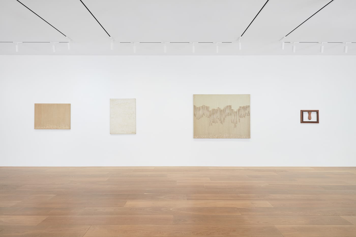 One of Lee’s early masterworks, “Godret Stone” (1958), also uses and transforms common everyday materials. Here the artist has fastened small carved stones to ropes, hanging them at different heights from a horizontal wooden plank fixed to the wall. The inspiration for this work is a weaving device once used in Korea, which employed a series of small stones to hold the garment in shape as it was being woven. In “Godret Stone,” the stones have no particular function, thus raising the question of their significance once their original use has been left behind