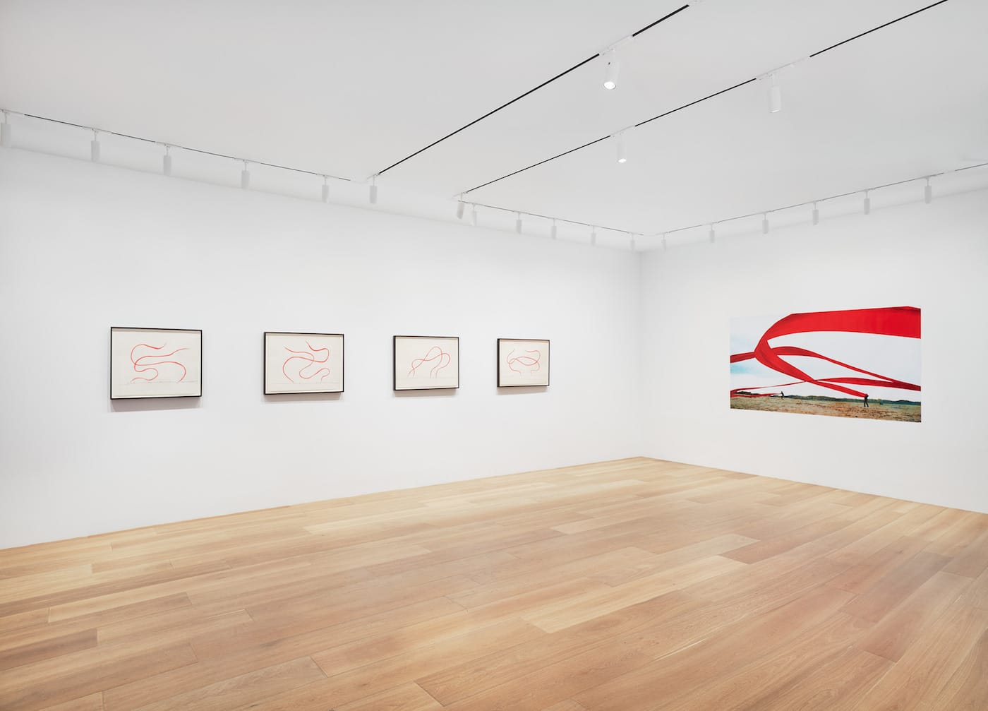 Another theme in Lee’s work is an interest in the immaterial aspects of nature. One example of this is his three Wind paintings (1972–82), made by attaching wavy lines of rope to each canvas. Lee uses the rope to symbolize ripples created by the wind blowing over water. Wind is again employed in the installation Wind-Folk Amusement (1971), in which three 80-meter strips of red cloth flutter in the windy skies on Nanji Island on the Han River. This is depicted in this show with a series of drawings in pencil and gouache (1971–90), along with a recent video of a re-enactment of the original installation (2015).