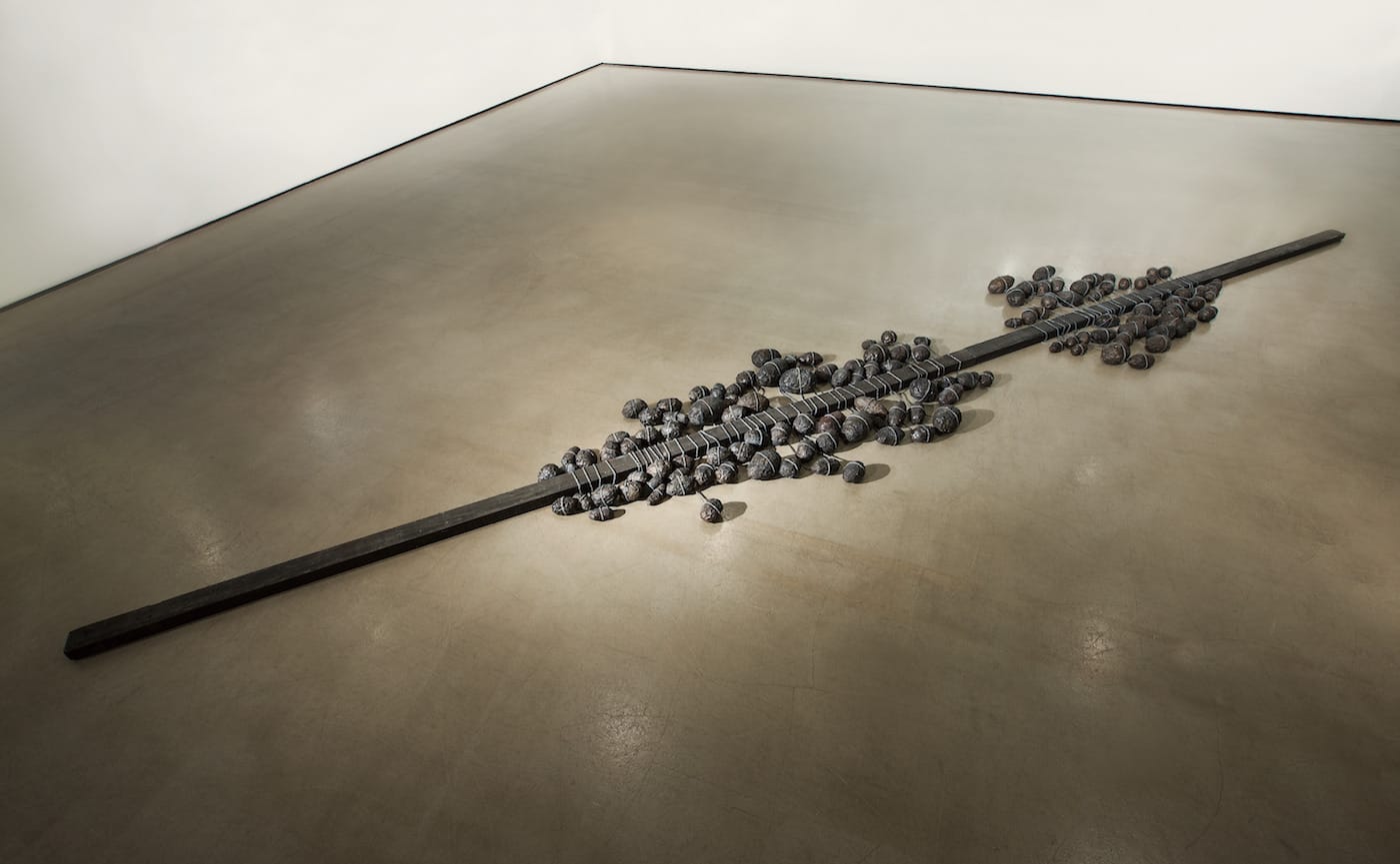 Lee’s radicalness accounts for his famous “Non-Sculpture” (1960), made early in his career. The work consists of an elongated wooden plank placed diagonally on the floor and wrapped with filaments of rope holding an assortment of small paper balls covered in ink. The appearance of this elegant work is opposite in every way from the art Lee was paid to do: casting figures of statesmen in bronze. Instead of being upright, it lays on the floor; instead of being unified, it is disparate and seemingly chaotic; and instead of exemplifying a superficial permanence, it is constructed from indigenous Korean mulberry paper that is said to have a duration of more than a millennium.